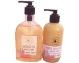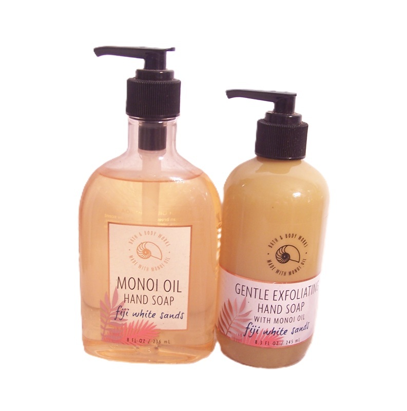 Wash away dirt germs with these hand soaps infused with skin conditioning Monoi OIl. Fiji White Sands is scented with notes of White Sands, Vanilla Orchid Warm Amber. Limited Edition. Set includes 1- 8.3 fl oz Gentle Exfoliating Hand Soap 1- 8 fl oz Monoi Oil Hand Soap.