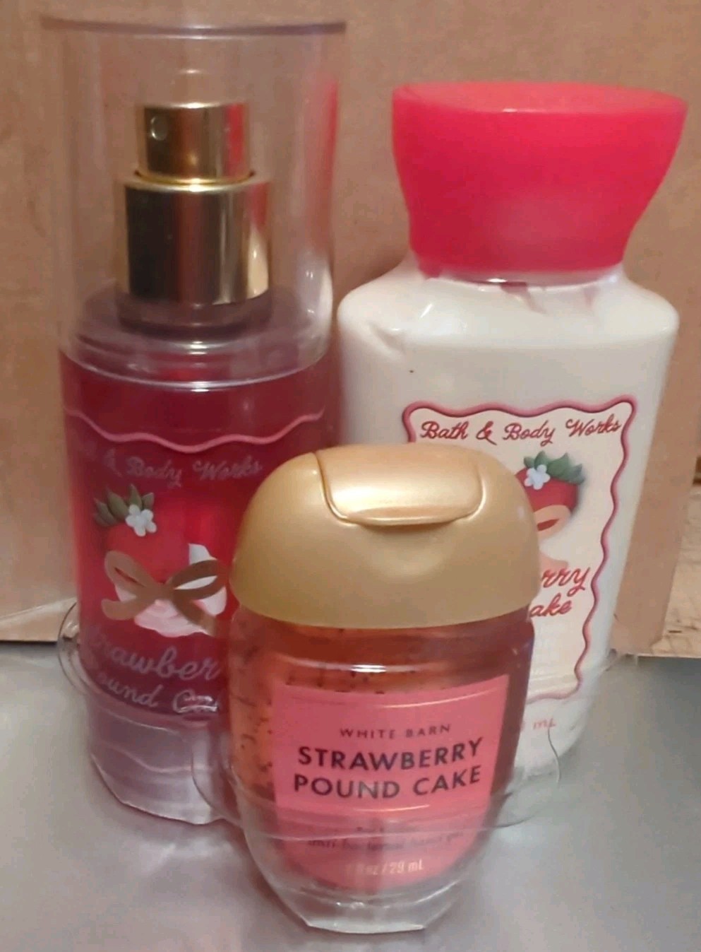 - Bath & Body Works Strawberry Pound Cake Lotion Mist & Hand Gel Lot Set Travel Sz