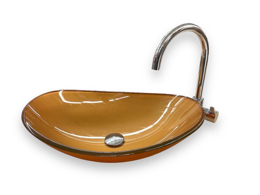 - Bathroom Counter Top Vessel Golden Tempered Glass Sink Boat Oval with Pop UP in