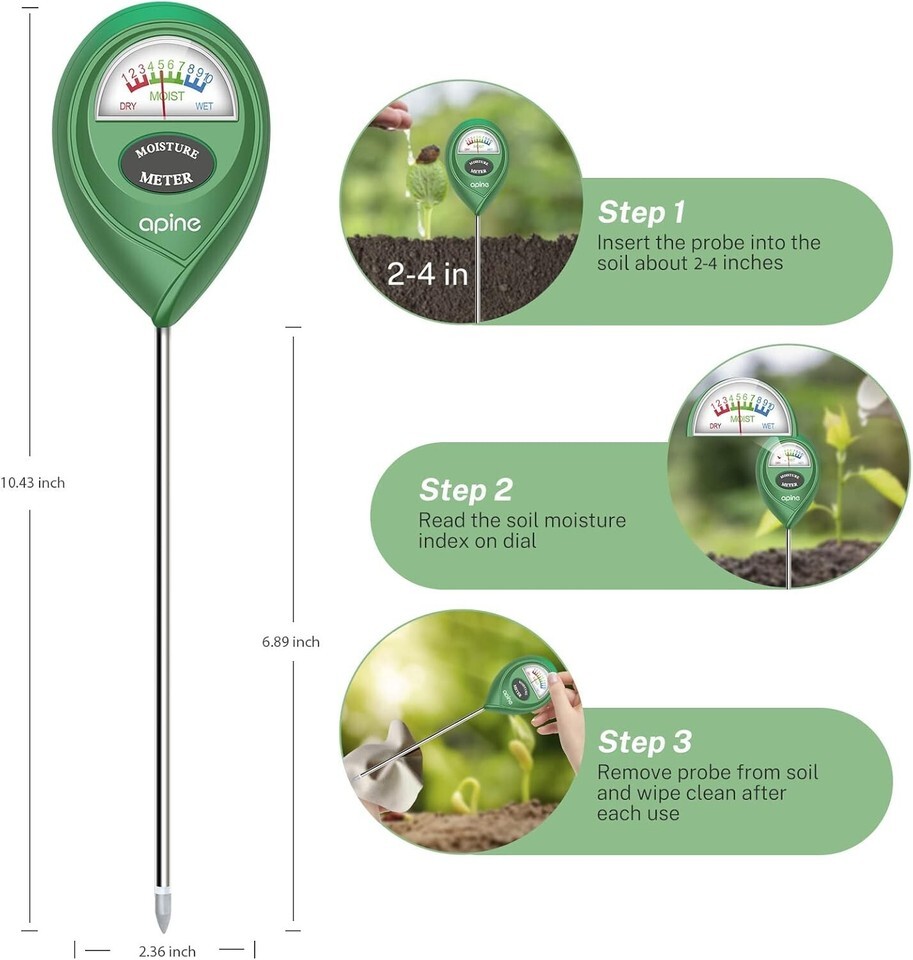 Quick Measurement: Simply insert the probe into the soil 2-4 inches deep and within seconds, receive an immediate soil moisture reading. Easy-to-read dial with clear color division ensures accessibility for all ages.
