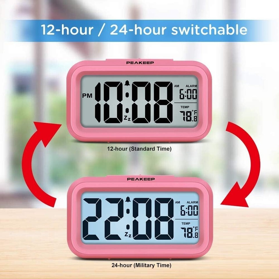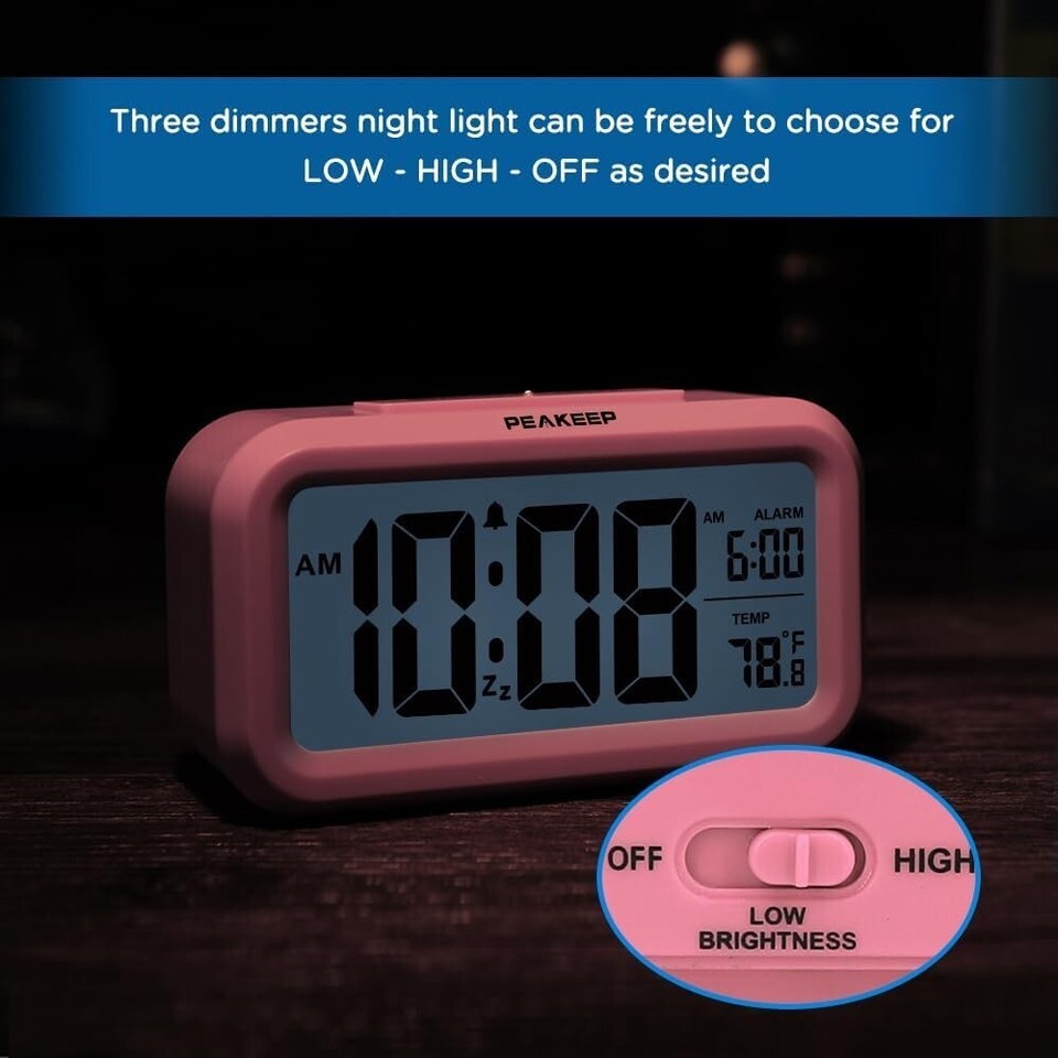 - Battery Operated Pink Digital Alarm Clock with Adjustable Brightness & Snooze