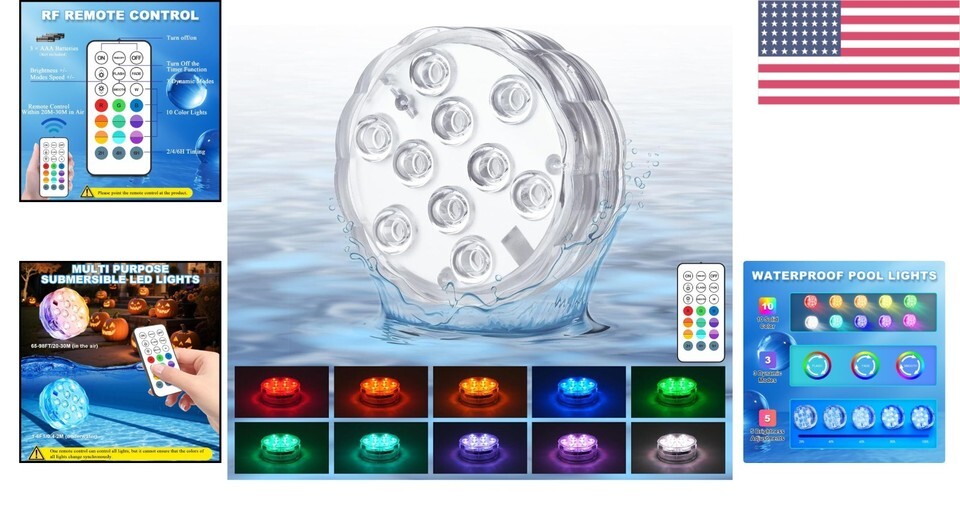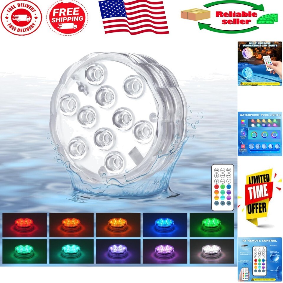 Battery Operated Submersible LED Pool Lights - Perfect for Hot Tubs More ? ? ? ? ? ? ? ? ? ? ? ? ? ? ? ? ? ? ? ? ? ? Battery Operated Submersible LED Pool Lights Illuminate Your Space with Elegance! Features: 10 static colors and 3 dynamic color-changing modes for versatile ambiance. Equipped with 10 super bright LEDs in a compact size of 2.75 x 1.18 inches to enhance pool areas effortlessly. Powered by 3 AAA batteries (not included) for 4 to 7 hours of continuous, stunning illumination. Includes 1 RF remote control with a remarkable range of 5 to 10 meters, allowing you to change settings from a distance. Waterproof with reinforced seal, making it ideal for both indoor and outdoor use. Multipurpose Applications: Perfect for hot tubs, swimming pools, fountains, aquariums, and ponds. Ideal decoration for boats, camping, parties, gardens, weddings, and festive occasions like Christmas and Halloween. Transform any room or event with enchanting lighting. Why Choose Our LED Pool Lights? Transform your ordinary pool into a captivating oasis! Our Battery Operated Submersible LED Pool Lights combine elegance with functionality. With a variety of colors and easy remote control access, you can create the perfect atmosphere for any occasion. The waterproof seal ensures durability and reliable performance at any depth?simply tighten the cap for assured protection. Whether you're hosting a summer party, decorating for a wedding, or just looking to relax in your hot tub, these lights elevate your experience, adding a touch of luxury to your evenings. Don't let your surroundings fade into darkness?order your Submersible LED Pool Lights today and let your creativity shine! Shipping Free Fast Shipping - We offer free shipping to most of the USA with a normal delivery time of 3-7 days. However, due to the current situation, additional delivery time (up to 3 weeks) may be required for some items. Alternative Carriers - We may use alternative carriers (e.g. USPS, FedEx, UPS, etc.) to ensure your package arrives safely and on time. Due to the use of multiple carriers, we are unable to provide a tracking number automatically. Handling Time - Orders are processed and shipped within 1-2 business days of receiving cleared payment. Shipping Restrictions - Shipping to Alaska, Hawaii, Puerto Rico, Guam, and other US territories may incur shipping charges or delivery restrictions. Please contact us before ordering, or your order can be refunded/cancelled. State Restrictions - There may be restrictions based on your state of purchase. For example, certain items may not be shipped to California due to state regulations. Contact for Tracking Updates - If you require tracking updates or have any concerns about the delivery of your order, please feel free to contact us, and we will be happy to assist you. Return 30-Day Hassle-Free Returns - We want you to be completely satisfied with your purchase. If you are not, you can return the item within 30 days of receiving it for a full refund or exchange. Easy Return Process - To start a return, simply contact us and we will provide you with a prepaid return shipping label and detailed instructions. Restocking Fee - There are no restocking fees for returns. However, the buyer is responsible for return shipping costs if the return is not due to a seller's error. Refund Processing Time - Refunds will be processed within 5 business days of receiving the returned item in its condition. Payment We accept all major credit cards, PayPal, and Apple Pay for your convenience. Your payment information is secure and encrypted to ensure a safe and seamless transaction. Please complete your payment within 3 days of purchase to avoid any delays in shipping. Feedback Your feedback is extremely important to us. We strive to provide the best products and customer service possible. If you are satisfied with your purchase, please take a moment to leave us a positive review. If you have any concerns or issues with your order, please contact us before leaving negative feedback. We are committed to resolving any problems and ensuring your satisfaction. Contact Us If you have any questions or concerns, please feel free to out to our customer support team. You can contact us through the messaging system. We are available Monday to Friday, 9:00 am to 5:00 pm EST, and we will do our best to respond to your inquiry within 24 hours. Buy it now and enjoy a pleasant shopping experience! Unit Quantity: 1 Power Source: Battery Suitable For: Above Ground Pools,Hot Tubs,Inflatable Kid Pools,In Ground Pools Material: Polycarbonate Mounting: Free Standing,Hanging,Leaning,Suction Hooks,Wall Mounted,Submersible Type: LED Lighting Technology: LED Color: White Voltage: 4.5 V Light Color: Multicolor Item Diameter: 1.57 in Control Style: Remote Control Power Consumption: 15 W