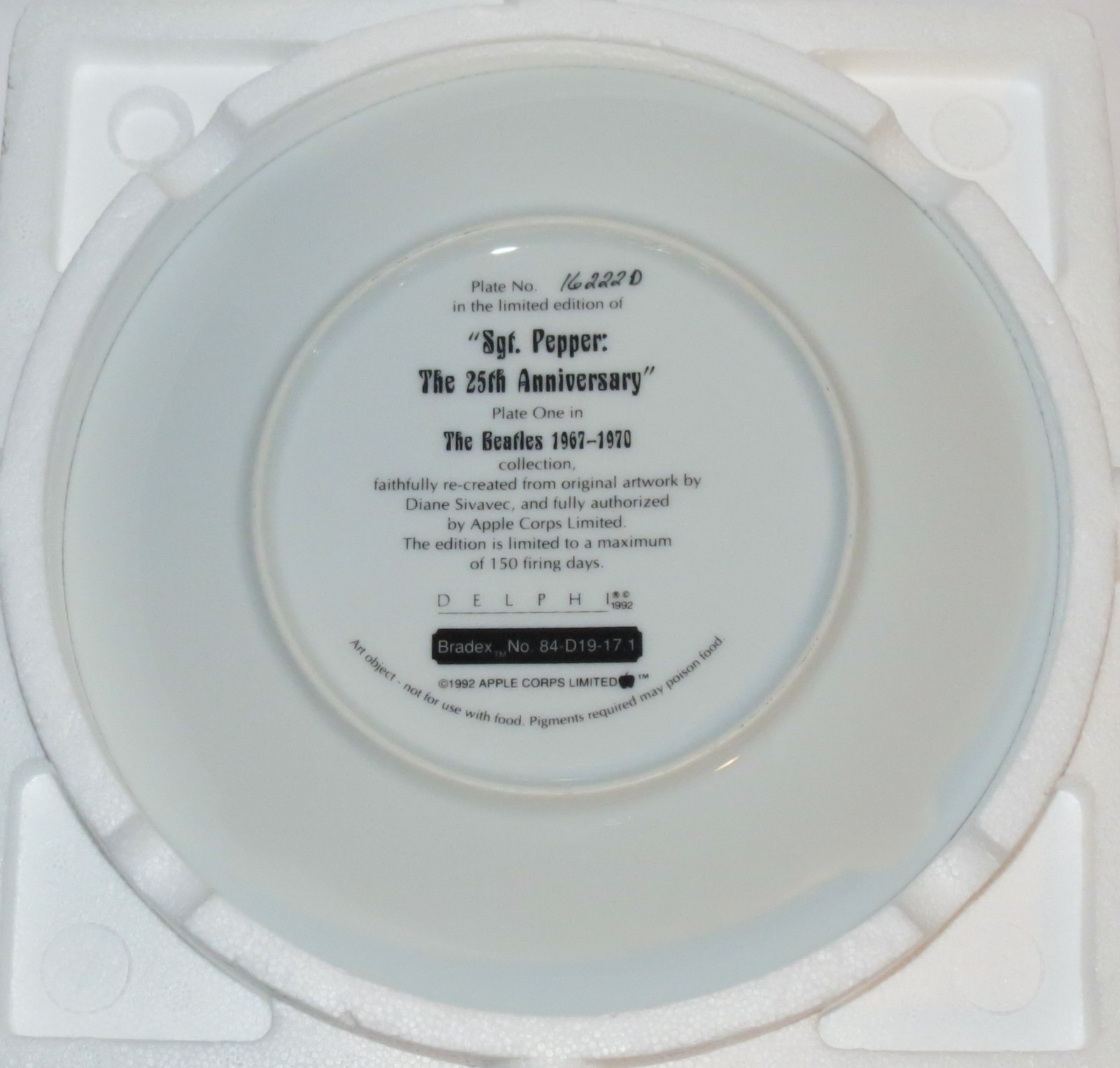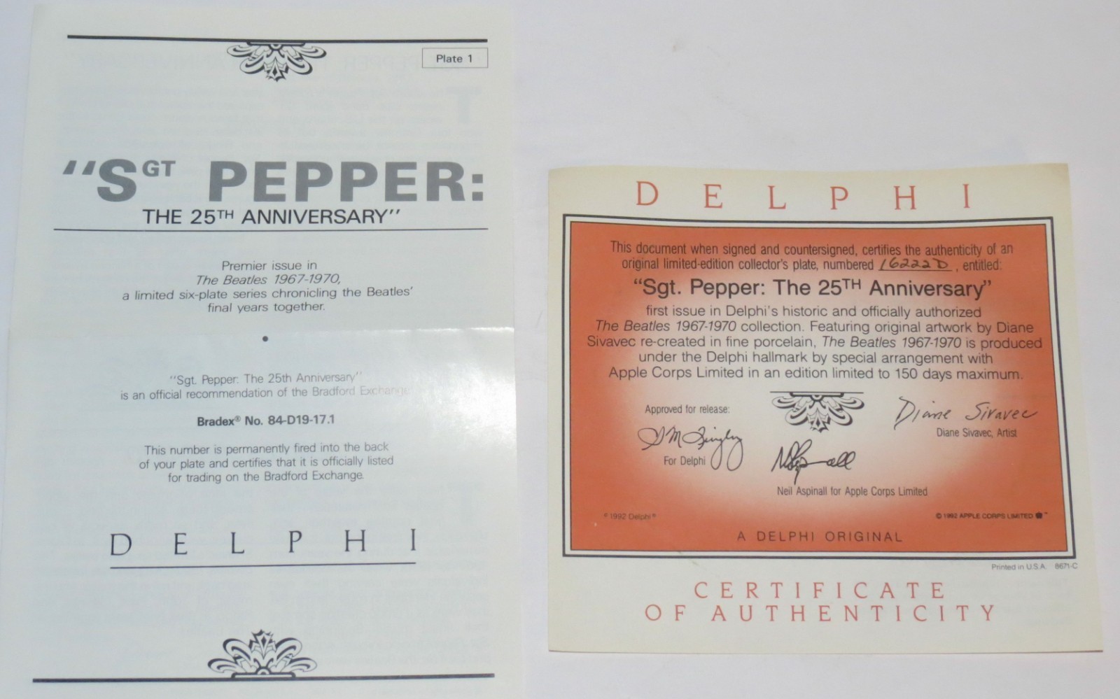 - Beatles Sgt. Peppers Lonely Hearts Club Band 1992 Bradford Exchange Plate & COA