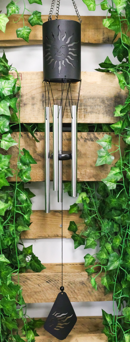 ? Bring celestial energy to your outdoor space with this Belenos Sun God Hanging Solar Wind Chime. This striking piece features intricate sun-themed filigree designs inspired by the ancient solar deity Belenos, glowing beautifully at night with solar-powered illumination. Crafted from durable black-coated steel, it combines soothing wind chime sounds with radiant solar light, creating a mystical and tranquil ambiance for your garden, patio, or balcony.