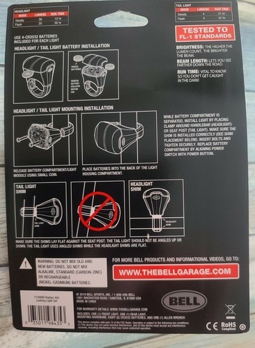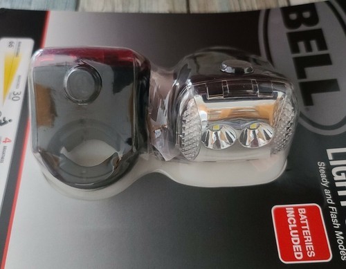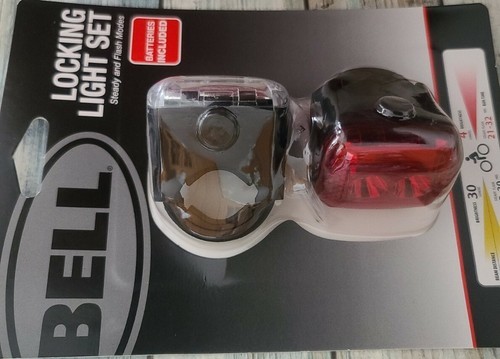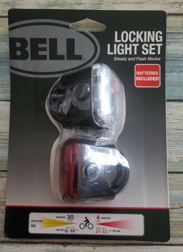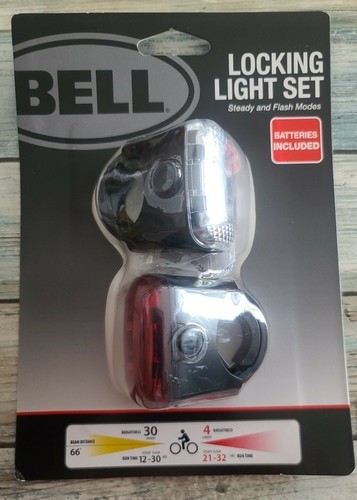This sale is for one (1) Bell Locking Light Set Steady Flash Modes Headlight ~ 30 Lumens ~ Steady light 12 hours ~ Flashing light ~ 30 hours ~ 66' Beam Distance Tail Light ~ 4 Lumens ~ Steady light 21 hours ~ Flashing light ~ 32 hours Model #7120856 Batteries included ~ Uses 4-CR2032 Batteries Please view photos for a good description of this item Thank you!