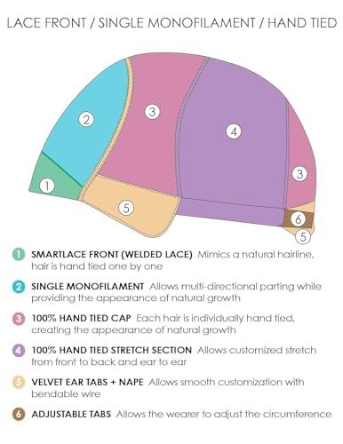 Bullet point: SmartLace Front - Ready-to-wear lace front creates a natural looking hairline that gives you amazing off-the-face styling versatility and contours to the shape of your head. Monofilament Top - Hand-tied and sheer top creates the illusion of a natural looking scalp and allows you to part the hair in multiple directions. 100% Hand Tied - Completely hand-knotted stretch cap creates supreme comfort and natural movement, allowing each individual hair to move freely like natural hair.
