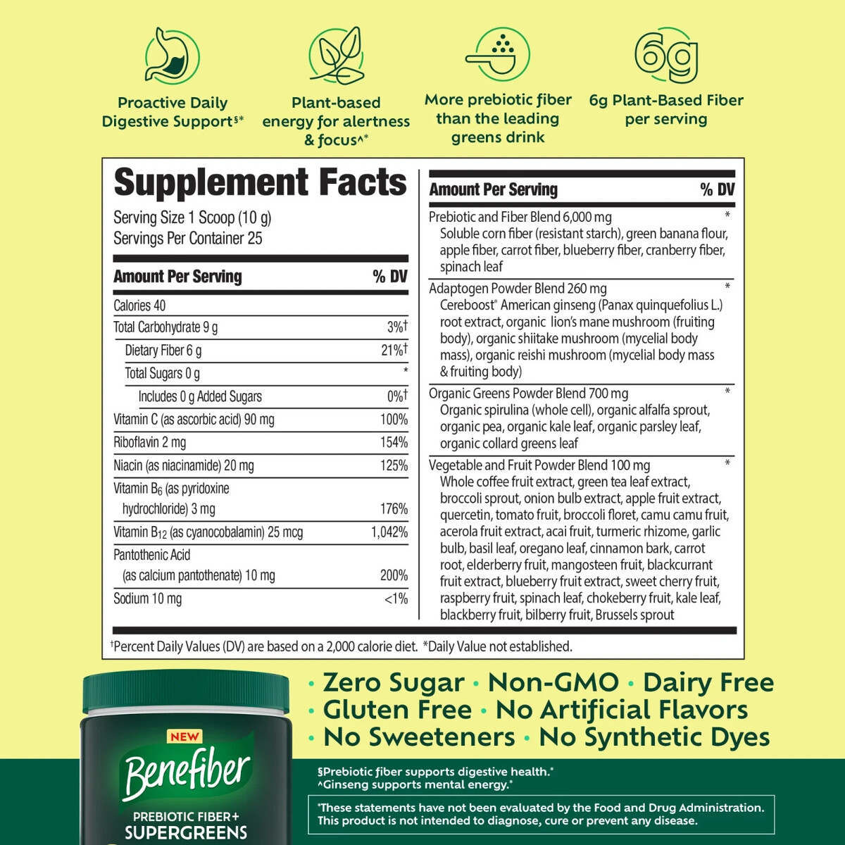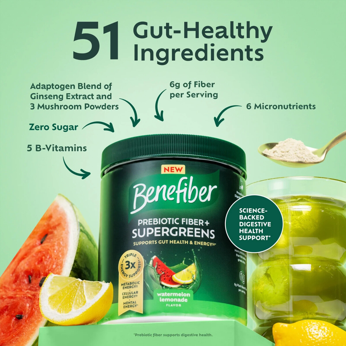 Benefiber Prebiotic Fiber + Supergreens Watermelon Lemonade Flavored Dietary Supplement Powder is specially formulated to support gut health and energy (2,4). With more prebiotic fiber than the leading greens drink, this dietary supplement helps nourish good gut bacteria and supports metabolic energy (3), cellular energy (1), and mental energy (5). This plant based, zero sugar, gluten-free, dairy-free, and non-GMO fiber powder is packed with 6 grams of fiber per serving and is free from artificial flavors, sweeteners, and synthetic dyes. With a watermelon lemonade flavor, this powder is easily dissolvable in cold water, making it an easy way to incorporate fiber and supergreens into your day. For adults, mix one scoop (10g) of Benefiber Prebiotic Fiber + Supergreens into 8oz of cold water, then stir or shake well before drinking. Benefiber Prebiotic Fiber + Supergreens is the perfect addition to your wellness routine, combining great taste with science backed prebiotic fiber to nourish your body every day (1) B-Vitamins support cellular energy (2) Prebiotic fiber supports digestive health (3) Prebiotic fiber supports metabolic energy (4) Prebiotic fiber supports metabolic energy, B-Vitamins support cellular energy, and Ginseng supports mental energy (5) Ginseng supports mental energy * These statements have not been evaluated by the Food and Drug Administration. This product is not intended to diagnose, treat, cure, or prevent any disease.