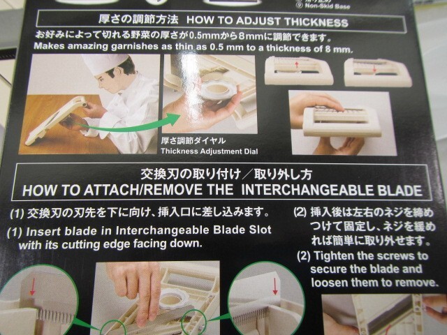 Three types of replaceable blades (small, medium, and rough teeth) can be used for both the old type "Benriner" and the new type.