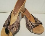 The Beverly Feldman Snake Reptile Print Crystal Studded Wooden Slides Mules Sandal in size 7 is a stylish and unique pair of heels perfect for various occasions including weddings, parties, casual outings, and formal events. Featuring an almond toe shape, slip-on closure, and high heel height with crystal accents, these vintage-inspired sandals are adorned with animal print and a bow detail. Made from 100% silk upper material and leather insole, these sandals are designed for comfort and sophistication, making them a standout addition to any wardrobe. Will need new heel taps soon. I use recycled materials for packaging whenever possible. bOx2 Please ask questions as all sales are final.