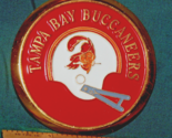 GENUINE BIG 3" (inch) DIAMETER TAMPA BAY BUCS MEDALLION COIN... 80s OR 90s VINTAGE FEATURING A "RETRO IMAGE OF THE PIRATE WITH DAGGER IN HIS MOUTH... I HAVE SEVERAL ALL UNSOLD BUT SHOWING SHOPWEAR AND HANDLING; OVERALL THEY ARE ALL IN EXCELLENT CONDITION