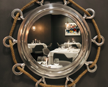 Extra Large Port Hole Mirror with rope edge border Great reflection of your good taste ! This silver polished aluminum port hole mirror is big and nicely crafted Age: New Age: New Construction: Polished Aluminum and Rope. Size: 18.5? diameter with a 1.5? depth.