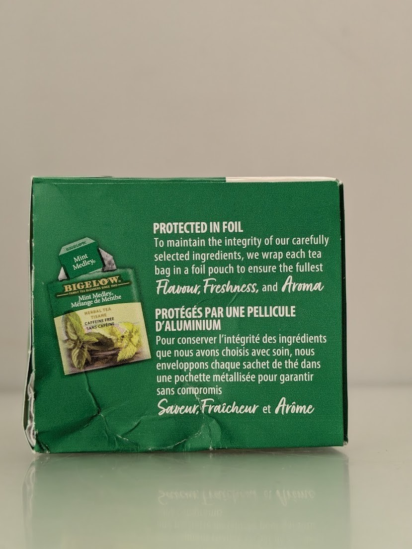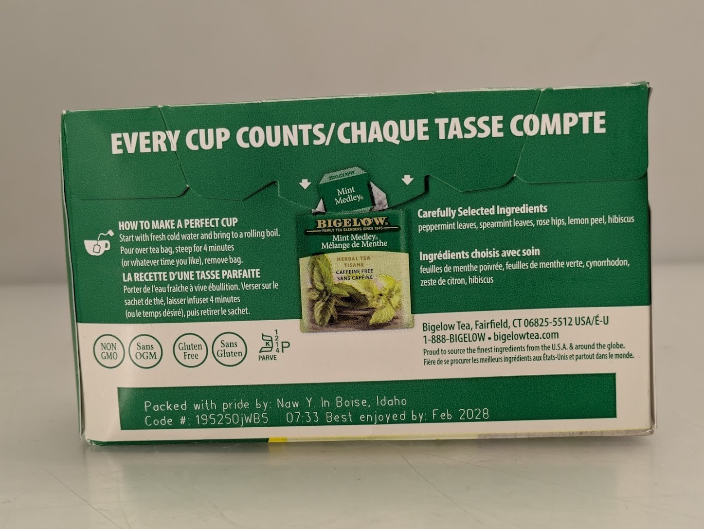 Item Condition New Item Location Ships from our warehouse in Las Vegas, Nevada, 89102, USA Fast Shipping We handle all paid orders within 1 business day. Best Offers Accepted Offers are reviewed at the close of business each night. We accept reasonable offers for - Multiple units of the same item - Errors or condition changes within our listing - Combining shipping for 2 or more separate orders Return Policy We offer a 30 day return window from when you receive the item. Items must be in the same condition and in original packaging. Product Description Refreshing, smooth, flavorful and aromatic Blend of cool garden spearmint and peppermint Mint sourced from American mint farms Individually wrapped in foil pouches for freshness Caffeine-free, Gluten-free, Non-GMO, Kosher Parve Since 1945 Bigelow Tea is Family Owned Blended Packaged in the USA Our family uses only the highest quality mint which is why our partnership with our mint farmers has existed for over 30 years. These American family farms share the same passion and best in class standards as we do. They go to great lengths to care for their crops using the most natural methods of farming. Our mint is simply second to none. Bigelow Mint Medley Herbal Tea is blended with both spearmint and peppermint creating an invigorating smooth taste. For over 75 years, the Bigelow Family carefully selected ingredients to deliver an uncompromised quality tea experience. Each tea bag is individually wrapped in a foil pouch to ensure full flavor, freshness and aroma. Each box contains 20 tea bags.