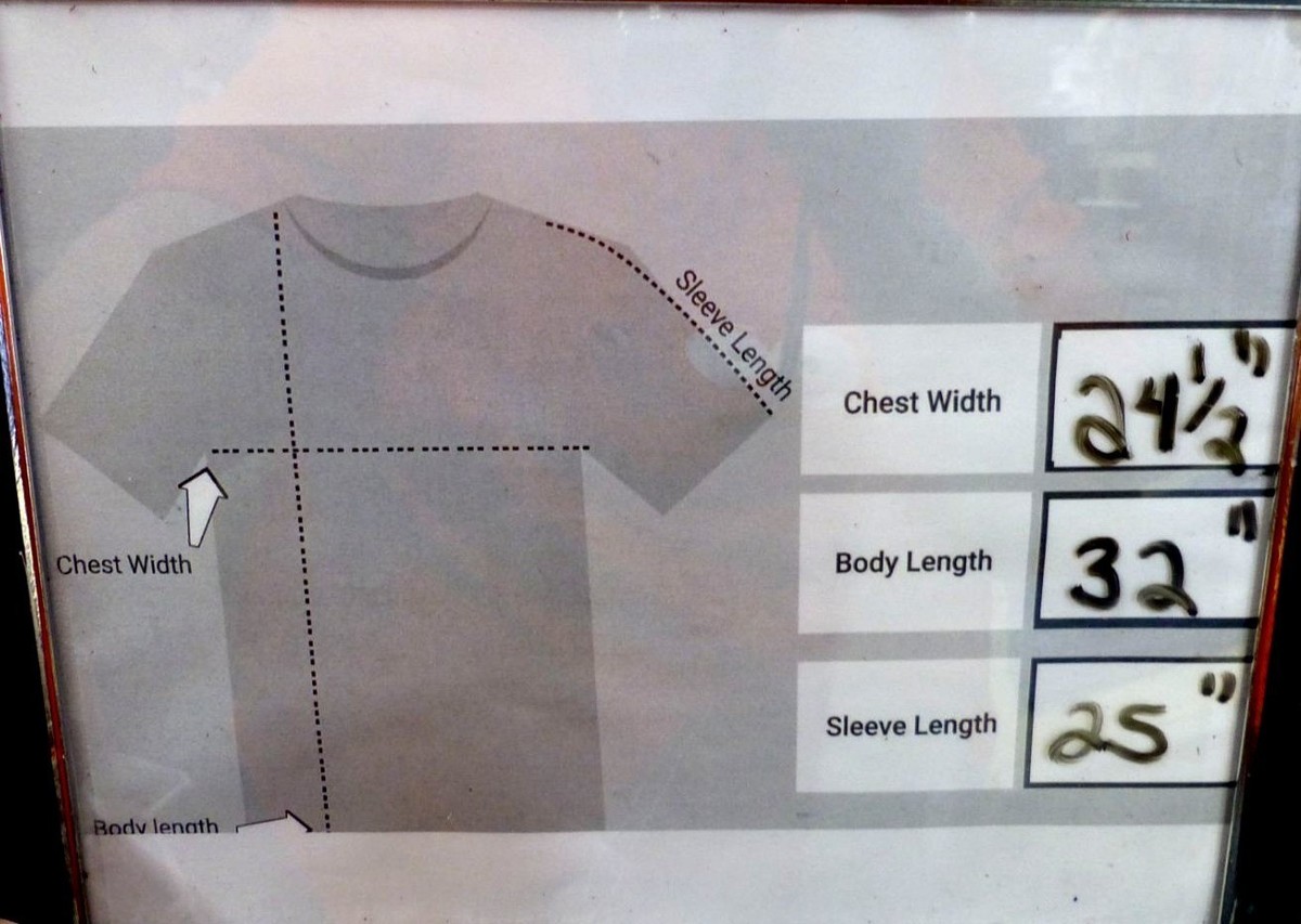Chest width = 24.5 inches, body length = 32 inches, sleeve length = 25 inches. Slight fading on fabric adds character.