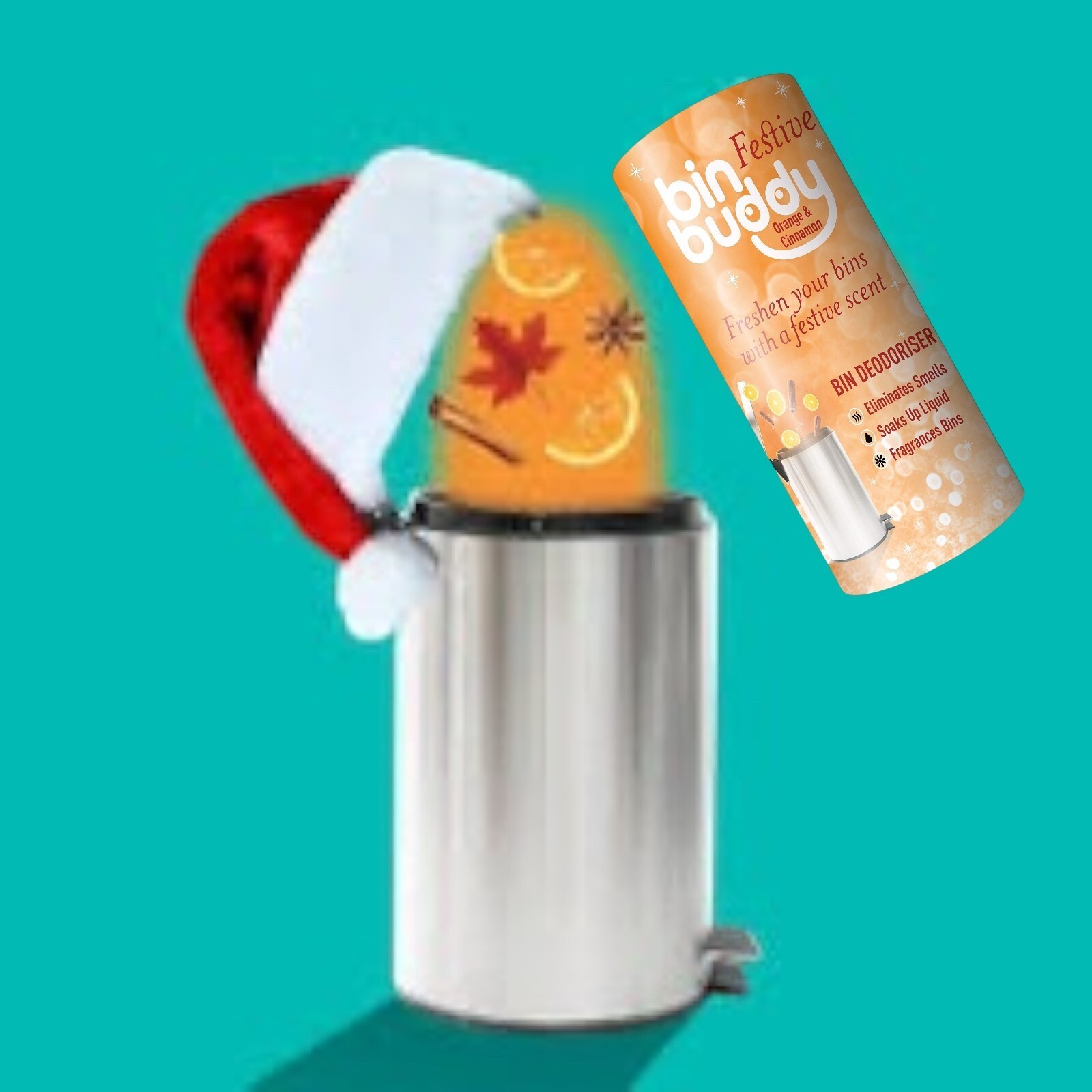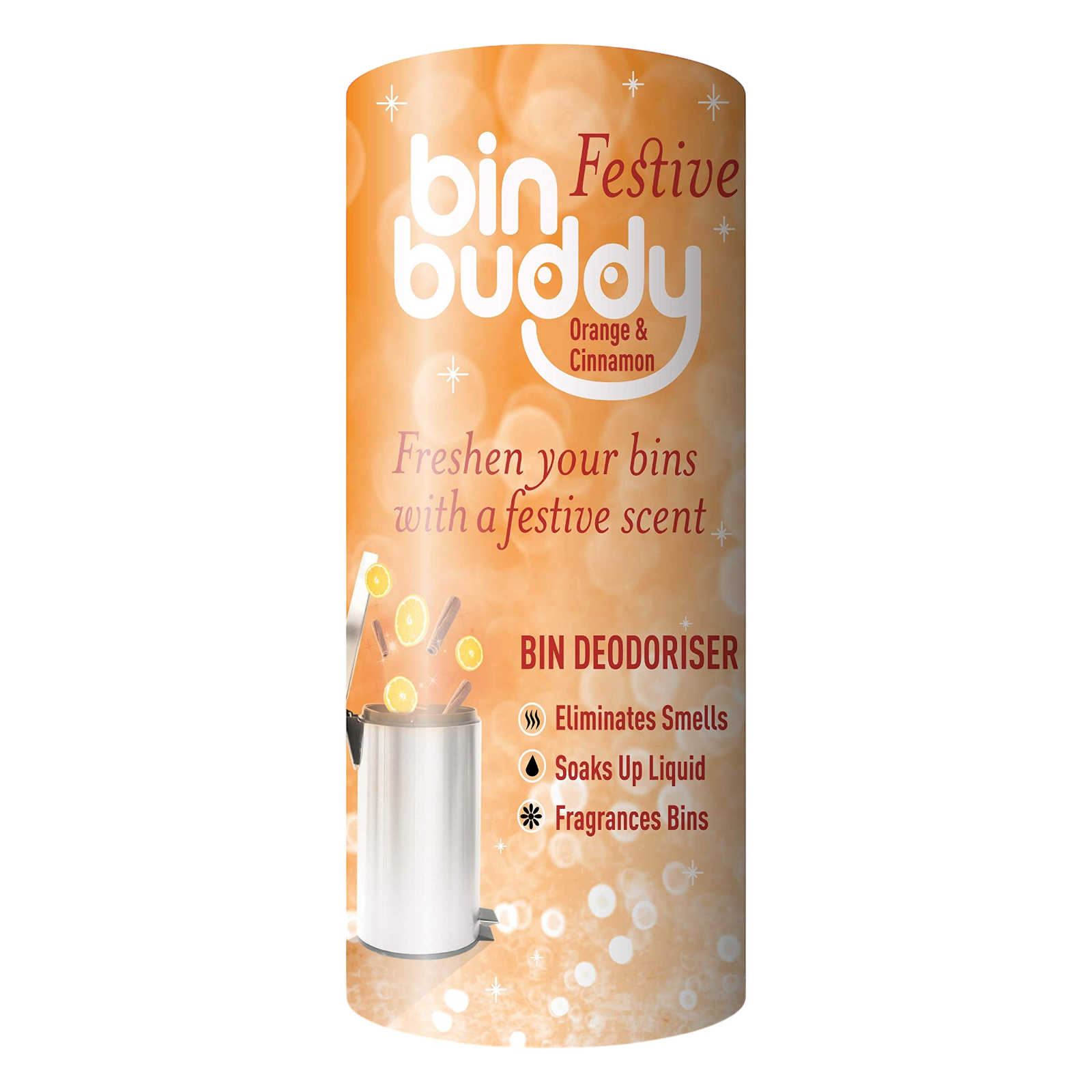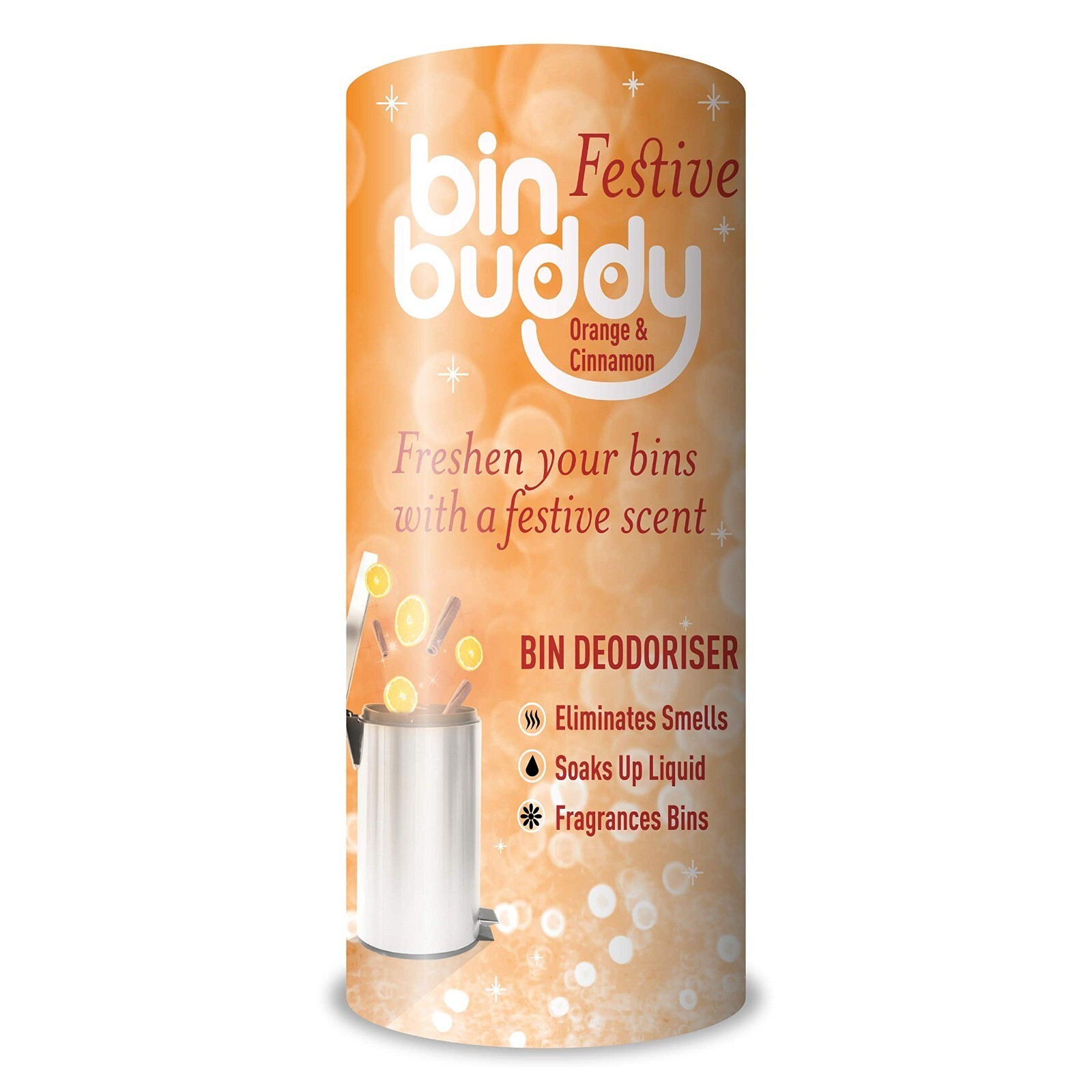 Bin Buddy Festive Trash Can Bin Deodorizer Orange and Cinnamon Fragrance 19 oz Brand new You will receive (1) ONE Cannister No returns on household KEEP BINS FRESH AND CLEAN ? good tidings we bring for you and your bin! Bin Buddy Festive Orange Cinnamon bin deodorizer can help remove those nasty smells from your bin, leaving a festive fragrance behind SOAK UP THE MESS ? Bin Buddy powder helps to soak up the mess by absorbing the runny liquids and smelly condensation that gathers at the bottom of your wheelie bins and bin bags for up to 42 applications! FESTIVE BIN DEODORISER POWDER ? deck your bins with smells of jolly! Say goodbye to unpleasant bin odors and celebrate Bin Buddy?s festive orange and cinnamon scented bin powder that?ll keep your bin fresh this season CONTAINS AN ODOUR ELIMINATOR ? don't just mask smells, eliminate them; our bin freshener removes the nasty smells in your bins and leaves our refreshing festive fragrance in its wake ? it?s the zest! IDEAL FOR INDOOR AND OUTDOOR BINS ? Bin Buddy Festive Orange Cinnamon deodorizing powder can be used in both indoor and outdoor bins; simply shake some powder into the bin every time you use it to keep it smelling great and get the most out of your bin bags!
