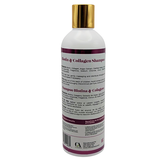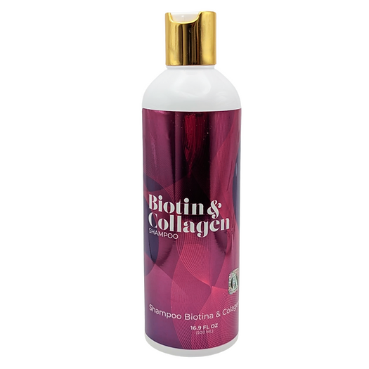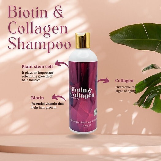 Biotin Collagen Shampoo 16.9 fl oz Main Ingredients Benefits: Biotin also known as vitamin B7 is formulated to help stimulate hair growth and even thinning hair. Collagen addds volume and dimension, and make your hair looks stronger, fuller, thicker, and healthier. Shampoo de Biotina y Colageno 500 ml Beneficios de los Ingredientes Principales: La Biotina, tambien conocida como vitamina B7, esta formulada para ayudar a estimular el crecimiento del cabello e incluso el cabello debilitado. El Colageno aporta volumen y dimension, y hace que tu cabello luzca mas fuerte, abundante, grueso y saludable.