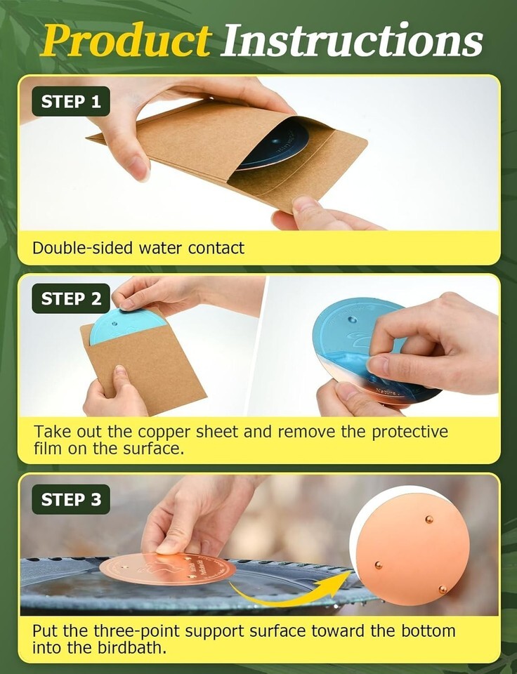 Simply place the copper disk in your bird bath and let it work its magic. The powerful purification capabilities of the disk will ensure clear and clean water, enhancing not only the appearance of your bird bath but also making it a healthier environment for birds.