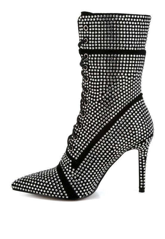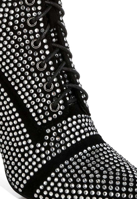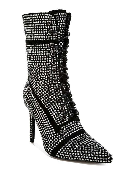 These boots are a sign that you should soon have a disco night! Everything glamorous and gorgeous, the rhinestones embellished boots are crafted with high quality microfiber and have a lace up design that ensures a snug fit. The comfortable insoles cut strain and offer a relaxed fit.
