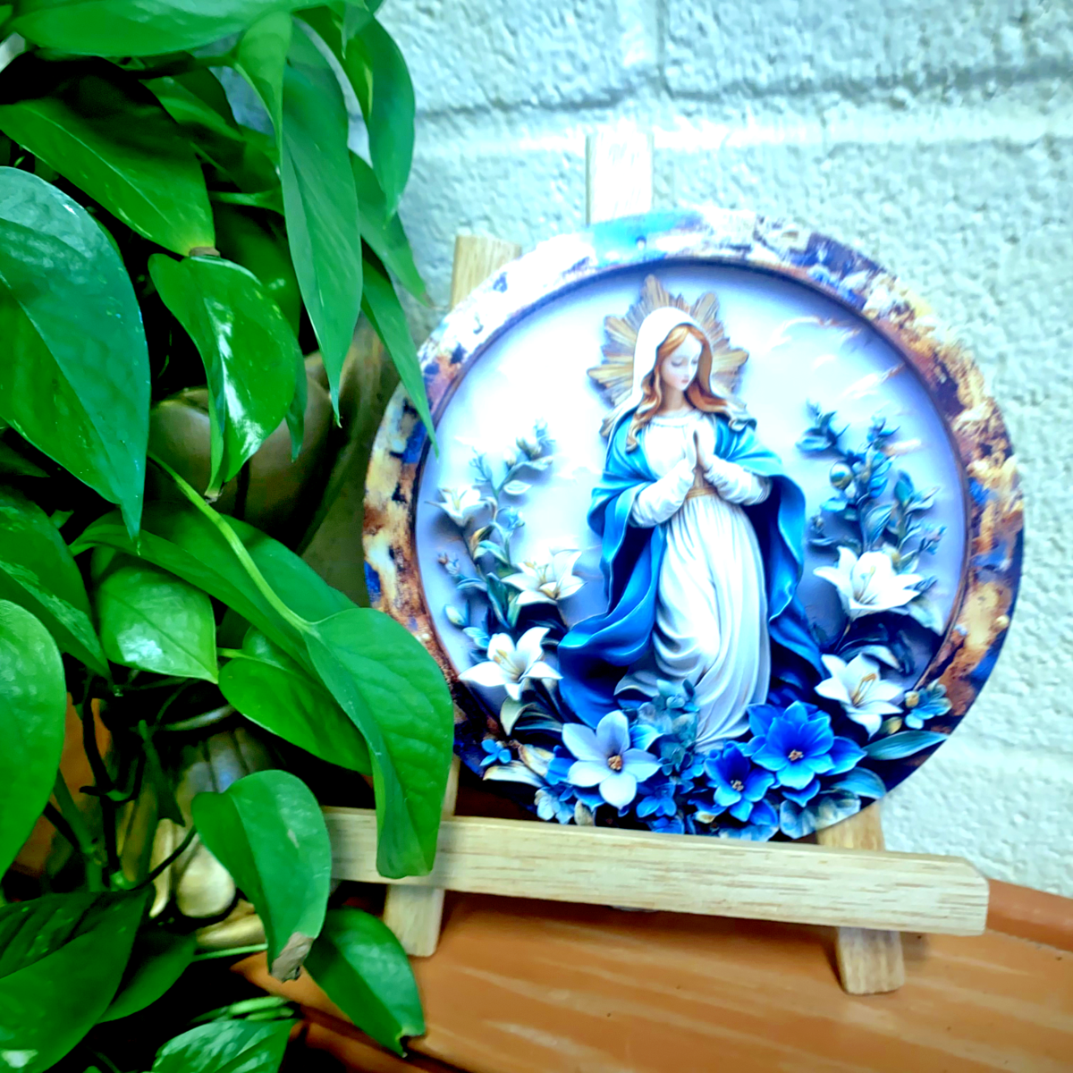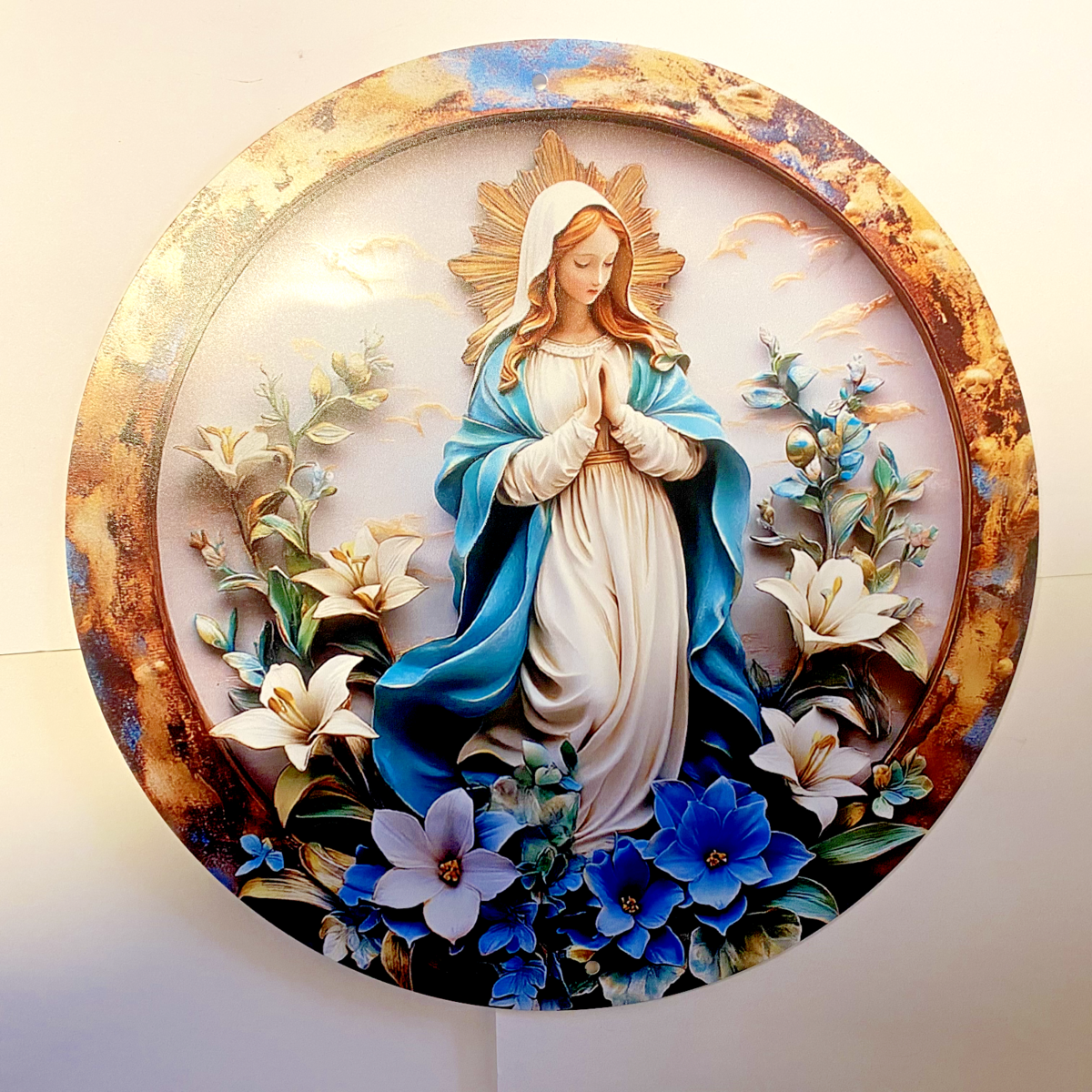 Your purchase is for a beautiful image of Blessed Mother Mary (Blue with Lilies) on aluminum.