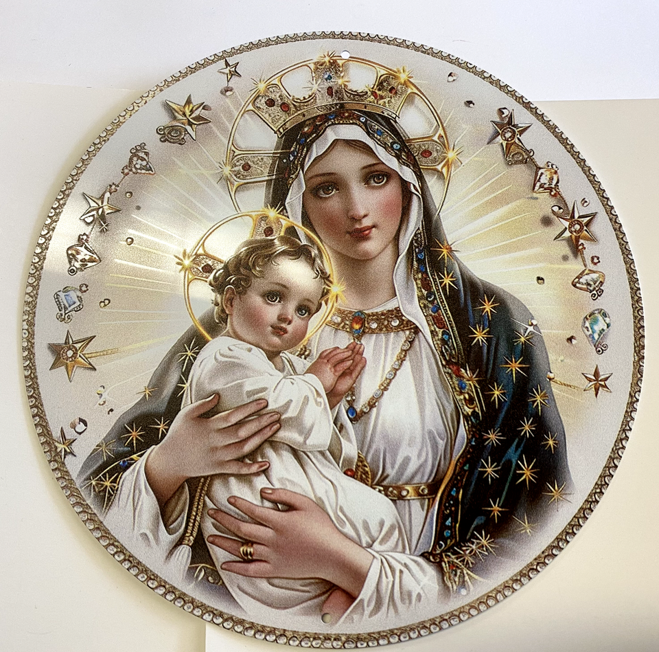 Bl Mother Mary with Child Image set on Aluminum 8" Round Image, New #ALM-013-R2