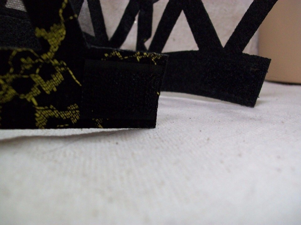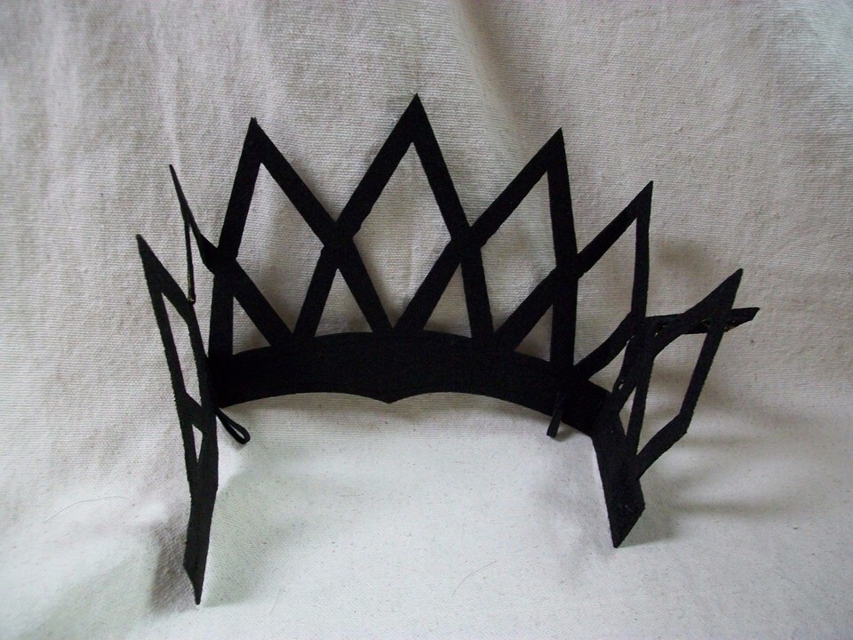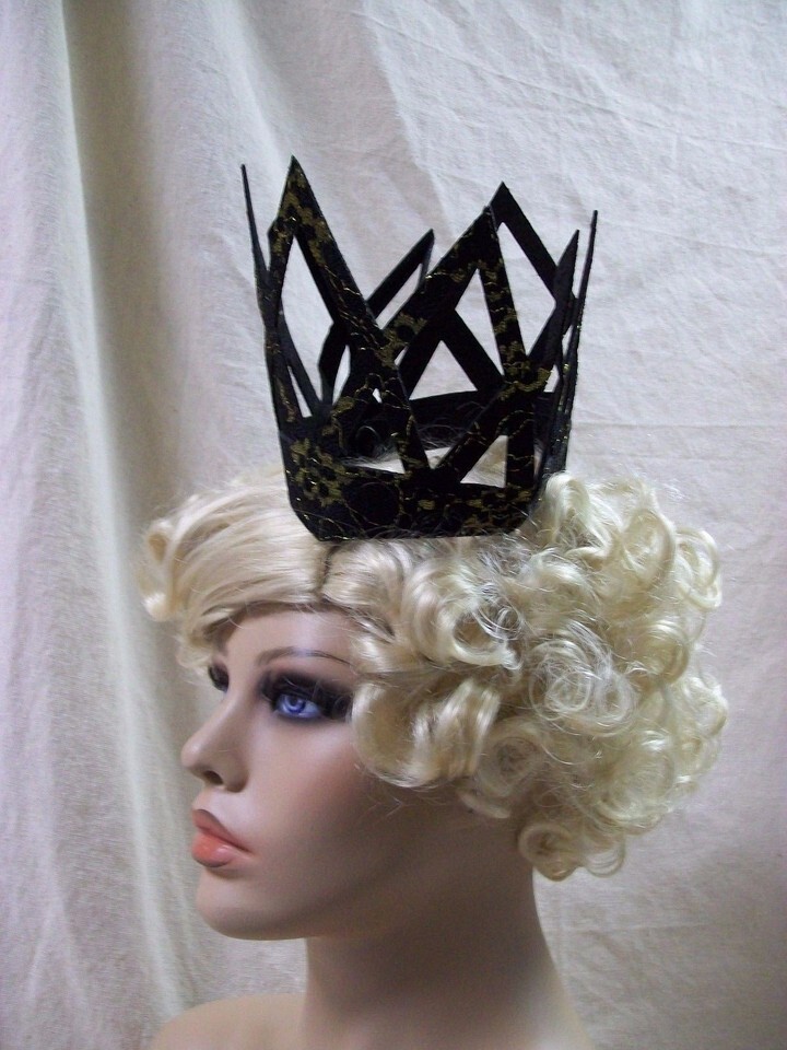 Adult Imperial Lace Fabric Costume Crown. Black Yellowish Gold. Velcro tabs in the back. Elastic loops on the sides. This crown will require hair pins to hold in place at the loops. (Hair Pins are not included). Lace look front. The back is plain black. It is fabric and some of the fabric is folded or has creases. One Size fits most. DOES NOT INCLUDE MANNEQUIN OR WIG. Would be used with costumes such as listed below: