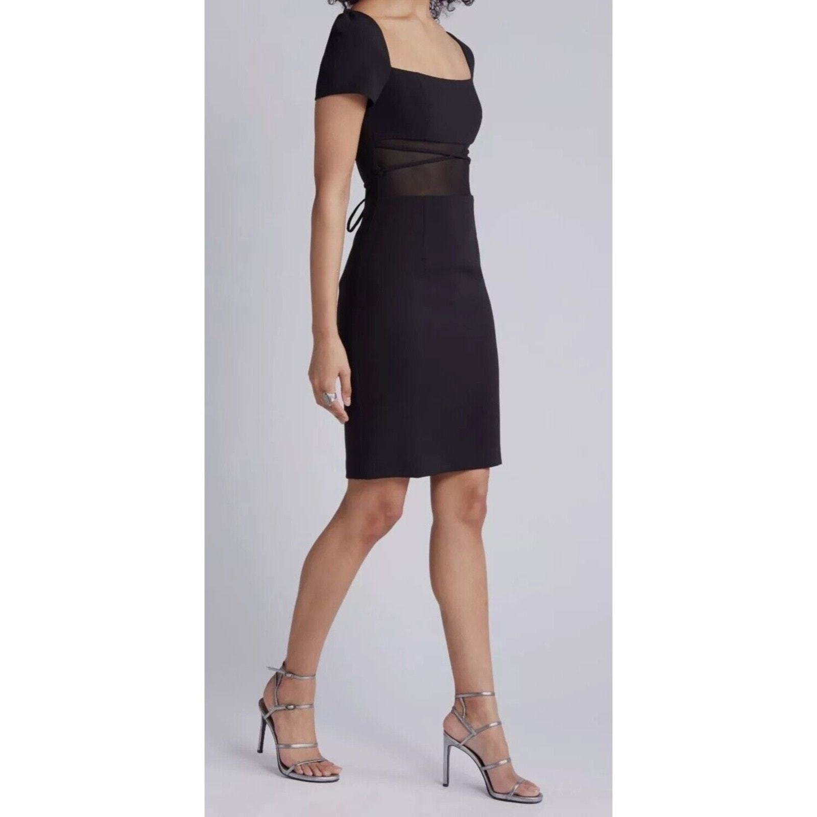 * Cut in a body-con silhouette, Black Halo's short-sleeve Izola sheath dress is defined by a sheer mesh panel at the front and self-tie closure at the back.