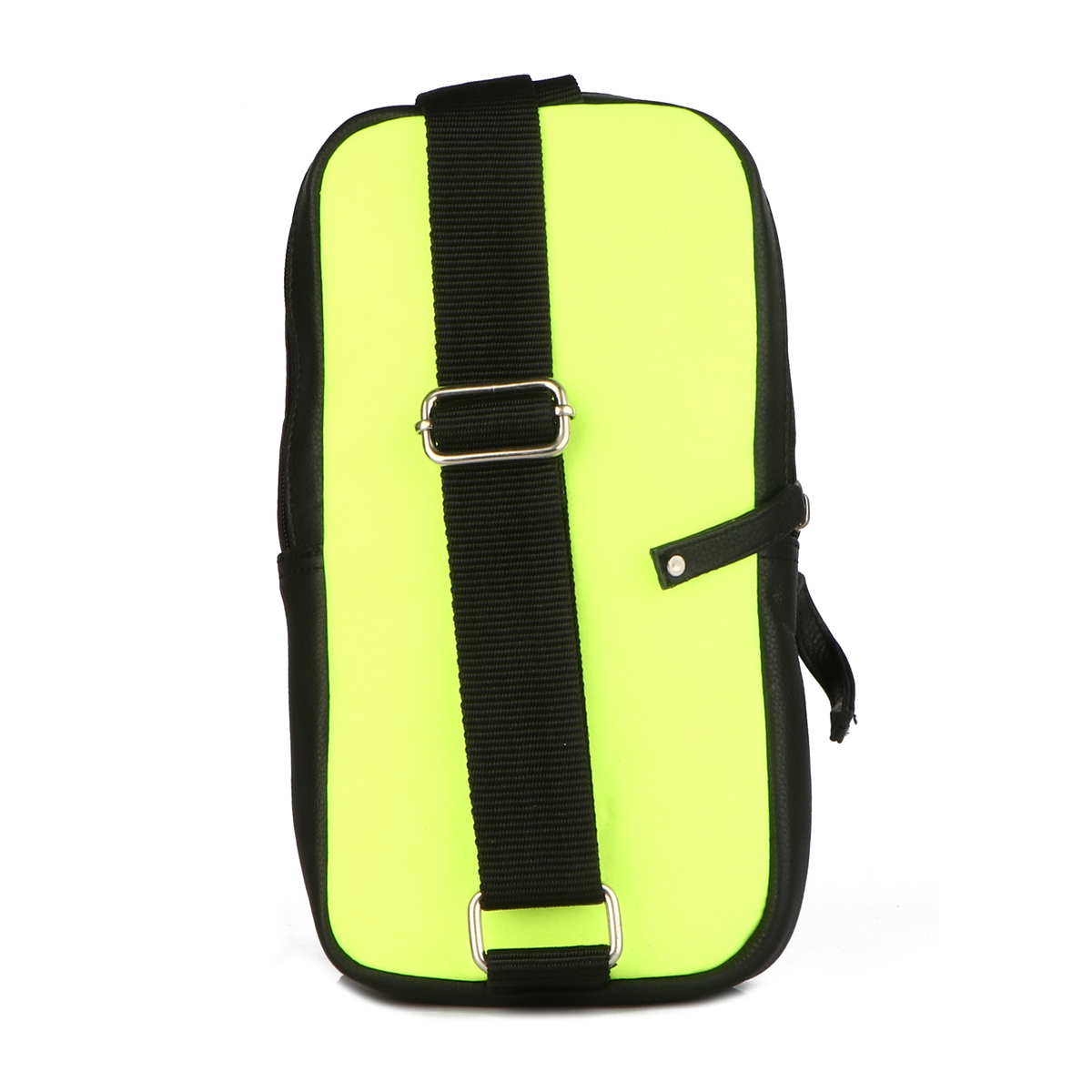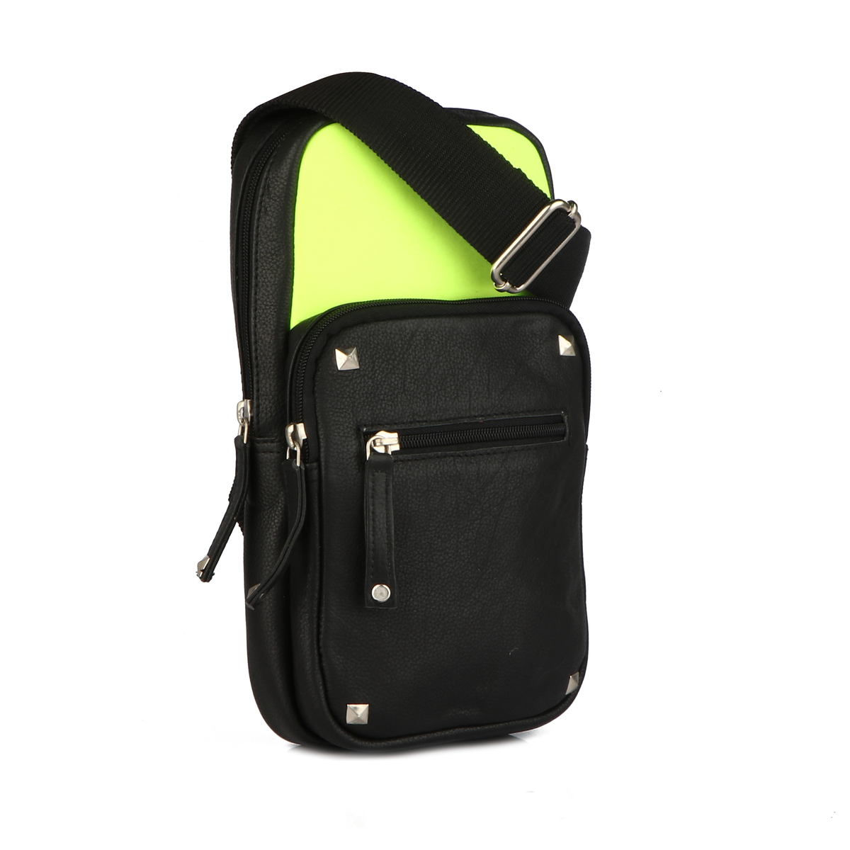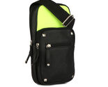 Challenger genuine black leather crossbody festival bag with lime green accents. The many compartments help store all your on the go needs. Complete with adjustable shoulder strap. Bag measures 7 " L x 2-1/2" W x 11" H.
