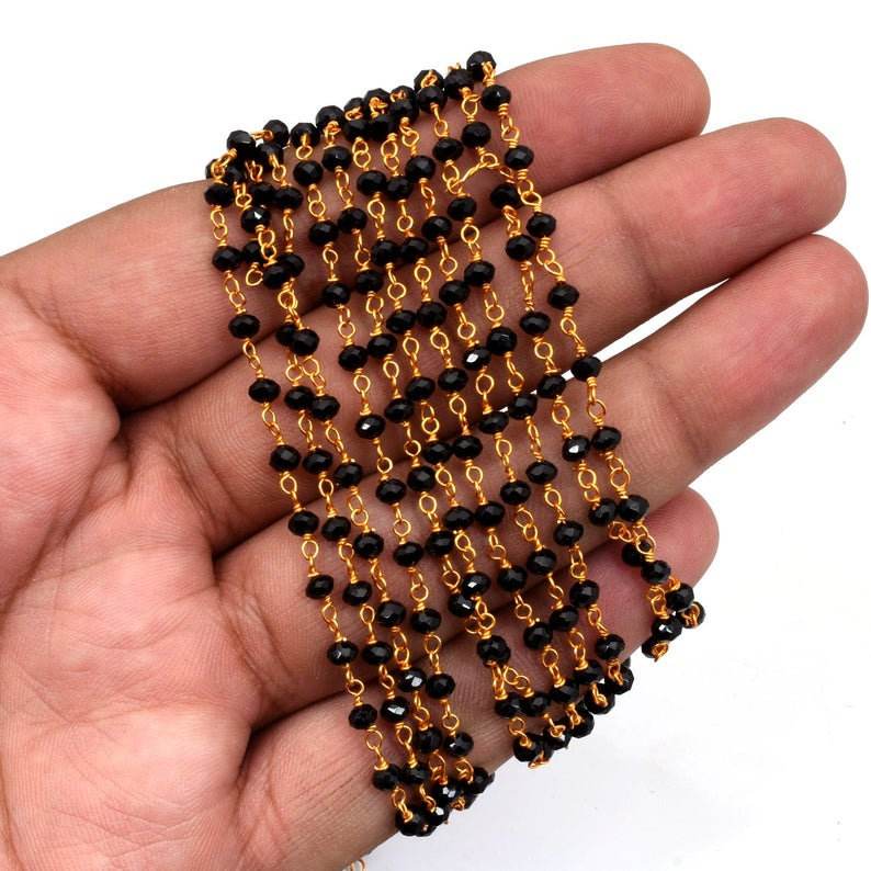Black Onyx Rosary Chain-Black Onyx Gemstone Beaded Chain-Wire Wrapped Chain-3.00mm to 3.50 mm Roundel Faceted Cut Gemstone Link Chain By Foot-Black Onyx