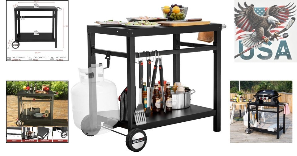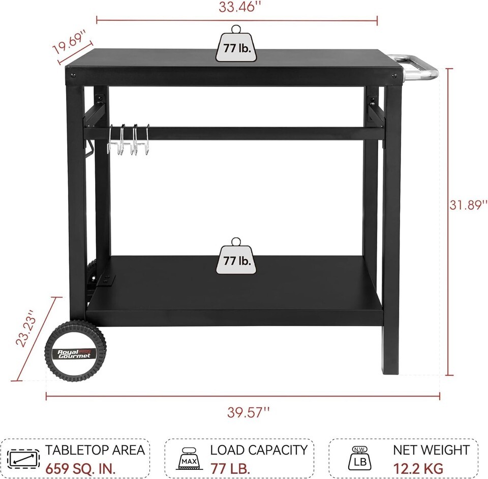 Spacious tabletop measuring 33.5" x 19.7", perfect for most BBQ griddle grills or pizza ovens, supporting a weight capacity of up to 77 lbs.