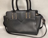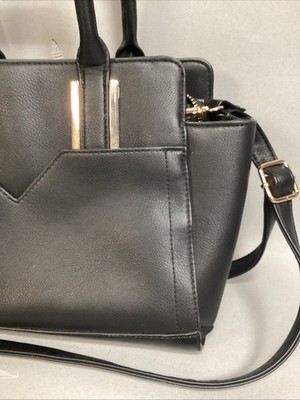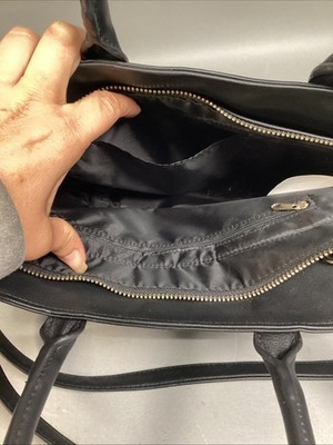 Black Synthetic Leather Purse. In good, used condition. Besides a few crumbs, the interior is clean. Made in Cambodia. There?s a strap for the shoulder and also handles. The strap is adjustable. The purse measures 13x3x9?