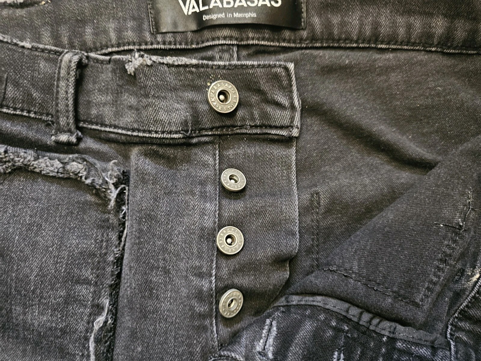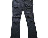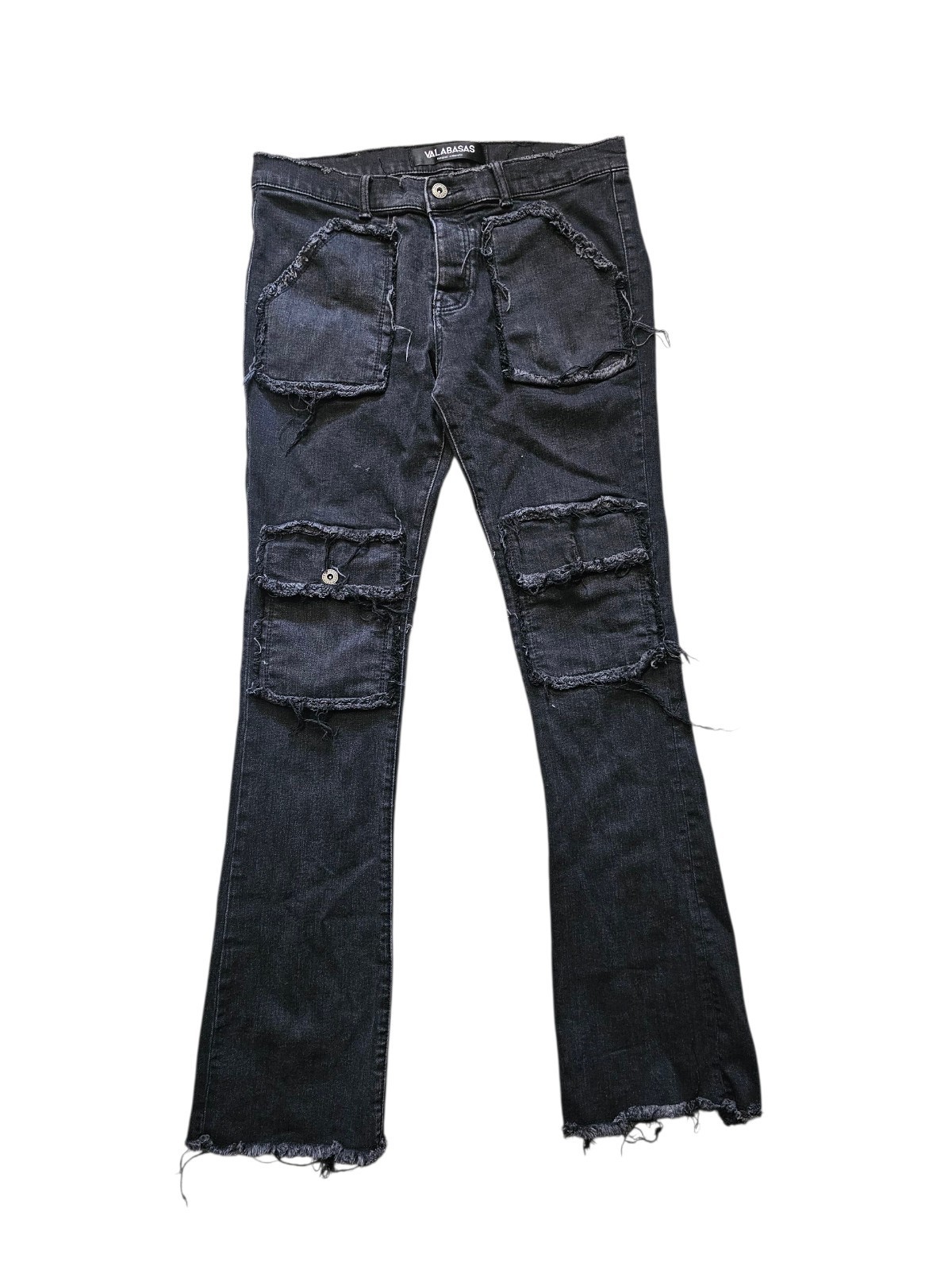 The Black Valabasas Stacked Flare Jeans in Men's Size 36x33 are a stylish and edgy addition to any wardrobe. Made from a durable cotton blend denim fabric with a dark wash, these jeans feature a button closure, mid-rise fit, and a flared leg for a unique and on-trend look. The black color and distressed accents give off a punk, grunge, and hip hop vibe, perfect for the winter, fall, and spring seasons. With a cargo pocket and 5-pocket design, these jeans are both fashionable and functional for any casual occasion.