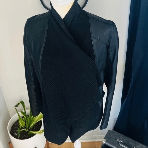 Blank NYC Drape Front Open Waterfall Faux Leather Wrap Moto Jacket Color: Black Size: Small EXCELLENT PREOWNED CONDITION, ALL MY ITEMS COME FROM A SMOKE PET FREE HOME Faux Leather Ribbed Drape Front Side Pockets Stretch Side Panel Classic Chic
