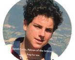 Approximate measurements: 2" in diameter. The sticker reads " Saint Carlo, Patron of the internet, pray for me"