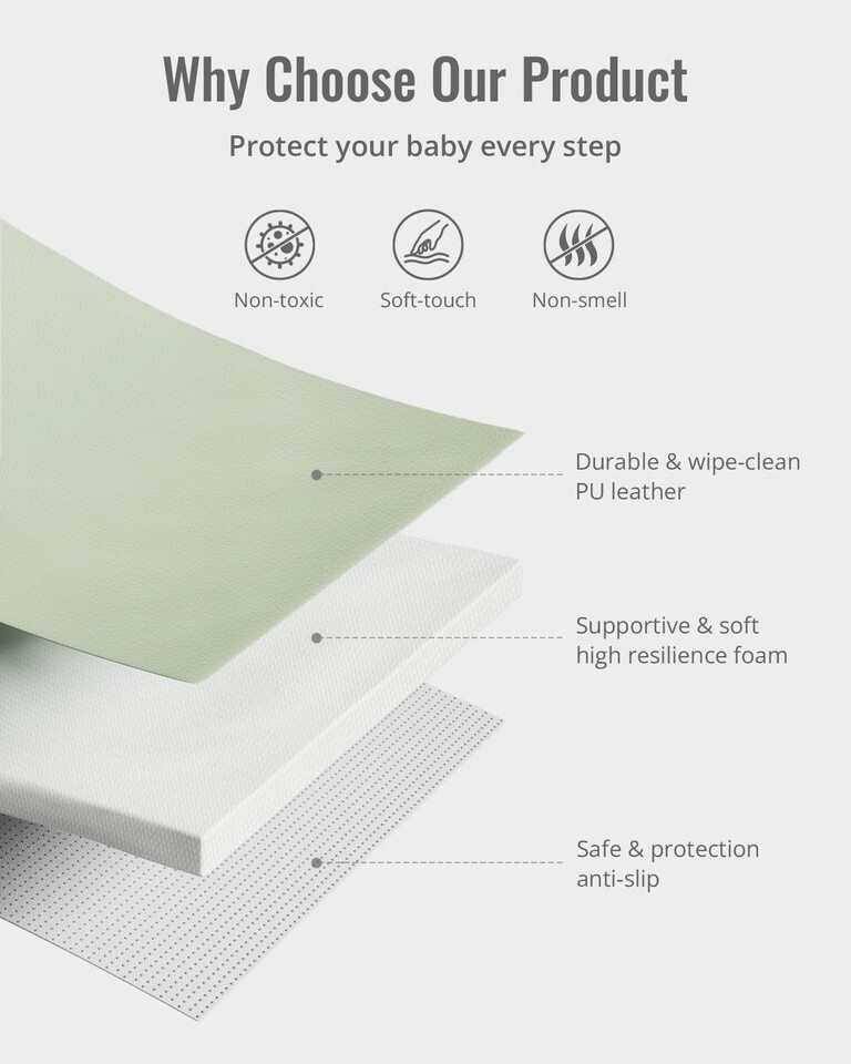 Prioritizing Baby's Safety: Crafted from premium vegan leather thats no harmful chemicals like PVC, phthalates, or toxins. Safety tested to meet CPSC standards for babies and children.Provide a safe space for your baby to explore, play, tummy time