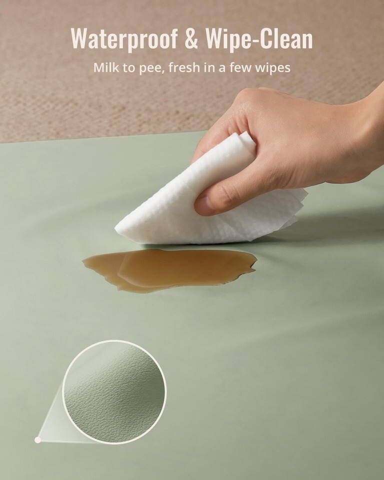 Waterproof Easy to Clean-Unlike many other mats that absorb spills, this vegan leather baby play mat is 100% waterproof, making it effortless to clean. Just wipe it down with a damp cloth to remove food, milk spills, or any other mess, keeping your babys play area spotless and hygienic