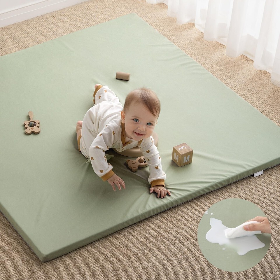 Provide your baby with a safe and stylish play area with our 50x50 inch baby play mat. Designed to 50 X50 In playpens, this mat is perfect for use in the living room, nursery, or playroom. Made from eco-friendly vegan leather and high-density foam, it offers a soft, cushioned surface for your little one to crawl, play, and relax. The waterproof and easy-to-clean vegan leather ensures effortless maintenancejust wipe away spills and messes with a damp cloth. Its durable, scratch-resistant surface withstands the wear and tear of daily use, making it ideal for households with babies and pets. The modern light green hue adds a touch of calm and complements any contemporary decor, creating a peaceful environment for your baby. Safe, comfortable, and long-lasting, this mat is an baby essential addition to any home with a growing baby.
