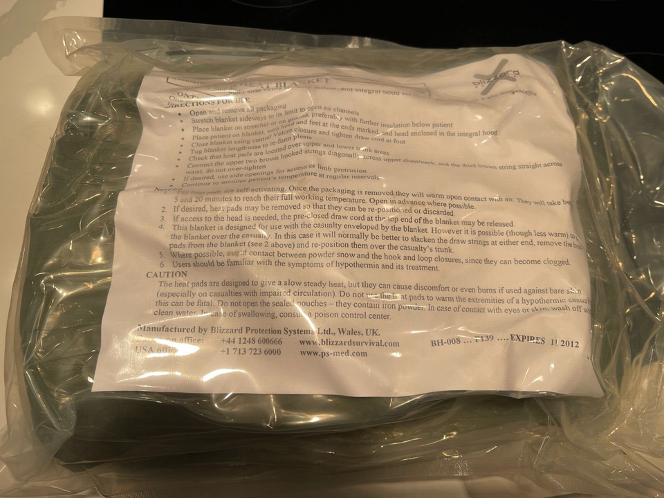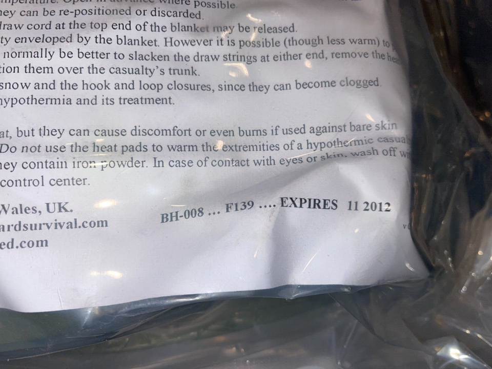 Blizzard Survival Emergency Hikers Camping Heat Blanket Military surplus BH 008 expiration date is 2012 2013 2015 / please know that these are still functional This is great for winter emergencies and should be an important item for your winter survival kit. Features: Complete head coverage with adjustable closures Easy-to-wrap patient placement with full length center Velcro access Total body core heating coverage with 4 large oxygen-activated heating pads (movable applications of all 4 pads) Full body access seams for quick vital sign check and extremity assessment Stretchable security cords help sustain and store heat close to the body core MAKE AN OFFER: WE NORMALLY REPLY WITHIN 24 HOURS THANK YOU FOR LOOKING AT OUR STORE WE ARE A PROUD VETERAN EMPLOYER, WE EMPLOY ALL BRANCHES, U.S. ARMY, U.S. AIR FORCE, USMC, U.S. NAVY AND CIVIL AIR PATROL. WE PROUDLY HIRE ALL VETERANS. WE SELL U.S. MADE MERCHANDISE MADE BY AMERICANS. SAVE ON SHIPPING BY BUYING MORE, WE DISCOUNT SHIPPING IF YOU HAVE MORE THEN ONE ITEM, IT WILL SAVE YOU MONEY AND IT WILL SAVE US MONEY. WE ARE FAST FAST FAST SHIPPERS: WE SHIP SAME DAY NORMALLY, IF YOU PURCHASE AFTER 5 PM WE WILL SHIP THE NEXT MORNING TO INCLUDE SATURDAY AND SUNDAYS, WE HAVE A COURIER PICKUP DAILY. WE HAVE A NO HASSLE RETURN POLICY, IF YOU HAVE A ISSUE WITH ANY ITEMS IN MY STORE, SIMPLY CONTACT US AND I WILL FIX IT. WE SEND TO INTERNATIONAL BUYERS IF THE ITEM MEETS THE REQUIREMENTS. ALL ITEMS IN MY STORE CAN BE SHIPPED INTERNATIONALLY VIA THE GLOBAL SHIPPING PROGRAM. ALL TAXES AND ADDITIONAL COUNTRY REGULATED FEES ARE THE RESPONSIBILITY OF THE INTERNATIONAL BUYER. EXCEPT FOR RESTRICTED COUNTRIES, WE WILL SEND IT TO THE SHIPPING CENTER IN KENTUCKY, AND WILL SEND IT TO YOUR ADDRESS IN YOUR COUNTRY. INTERNATIONAL BUYERS CANNOT BUY ANY MILITARY ITEMS IN MY STORE, OR ANY RESTRICTED ITEMS THAT DEEMS RESTRICTED. THE GLOBAL SHIPPING PROGRAM ALLOWS INTERNATIONAL BUYERS TO PURCHASE FROM UNITED STATES SELLERS LIKE MYSELF; TO ENROLL, SIMPLY CALL.