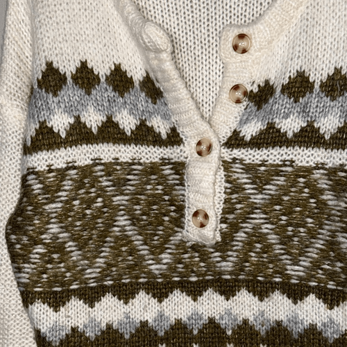Chic V-neck sweater with button details. Features a stylish green pattern on cream background. Ideal for casual wear.