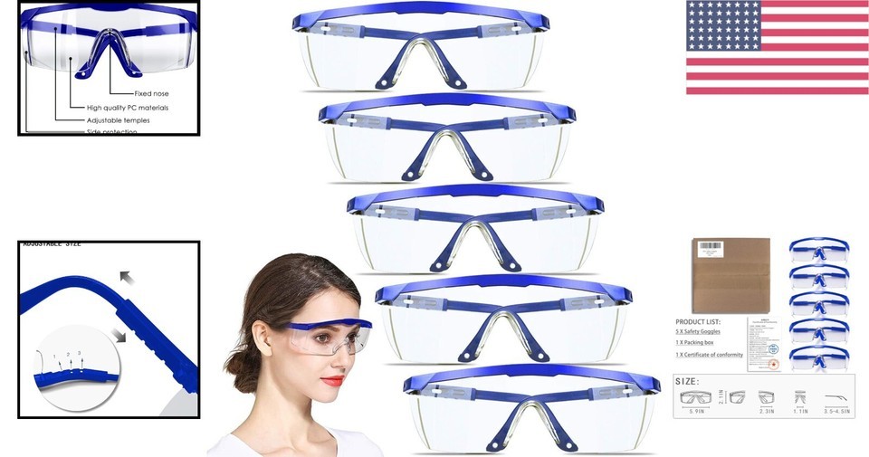 - Blue Adjustable 5PCS Safety Glasses - Lightweight, Fog-Proof, Shock-Resistant