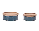 Add functional charm to your kitchen, living room, or office with this Set of 2 Blue Iron and Wood Canisters. Featuring a sleek blue iron base and warm wooden lids, these round canisters offer the perfect blend of industrial and rustic styles. Sized at 9" and 11" in diameter, they re ideal for storing small household items or simply enhancing your shelf or countertop d cor. Whether used for practical organization or purely aesthetic appeal, these canisters are a stylish solution for any modern or farmhouse-inspired space.