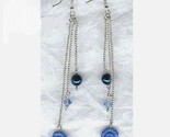 This is for a pretty pair of very long chain earrings with a pretty blue twirly glass czech beads, a sparkling swarovski Small AB sapphire crystal and a deep sapphire blue glass pearl. I put them on surgical steel silver plated hooks and chain and total length is just over 4 1/2" long including the hook. Very pretty!!