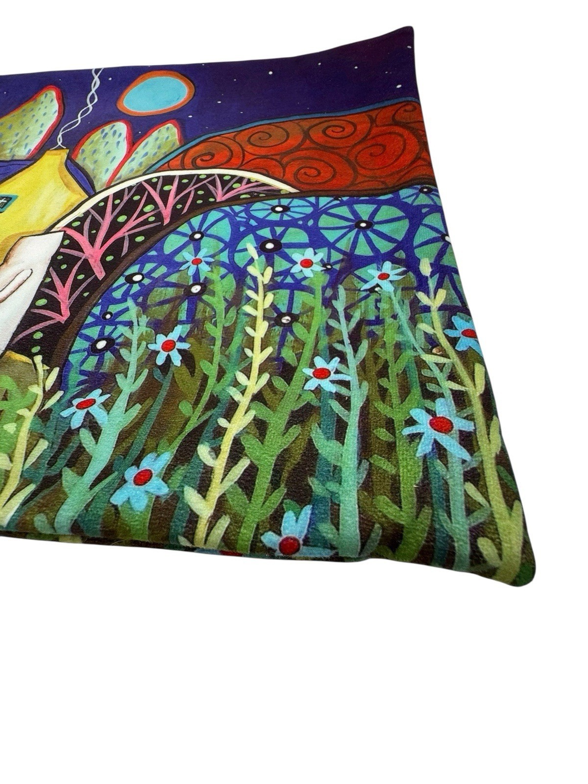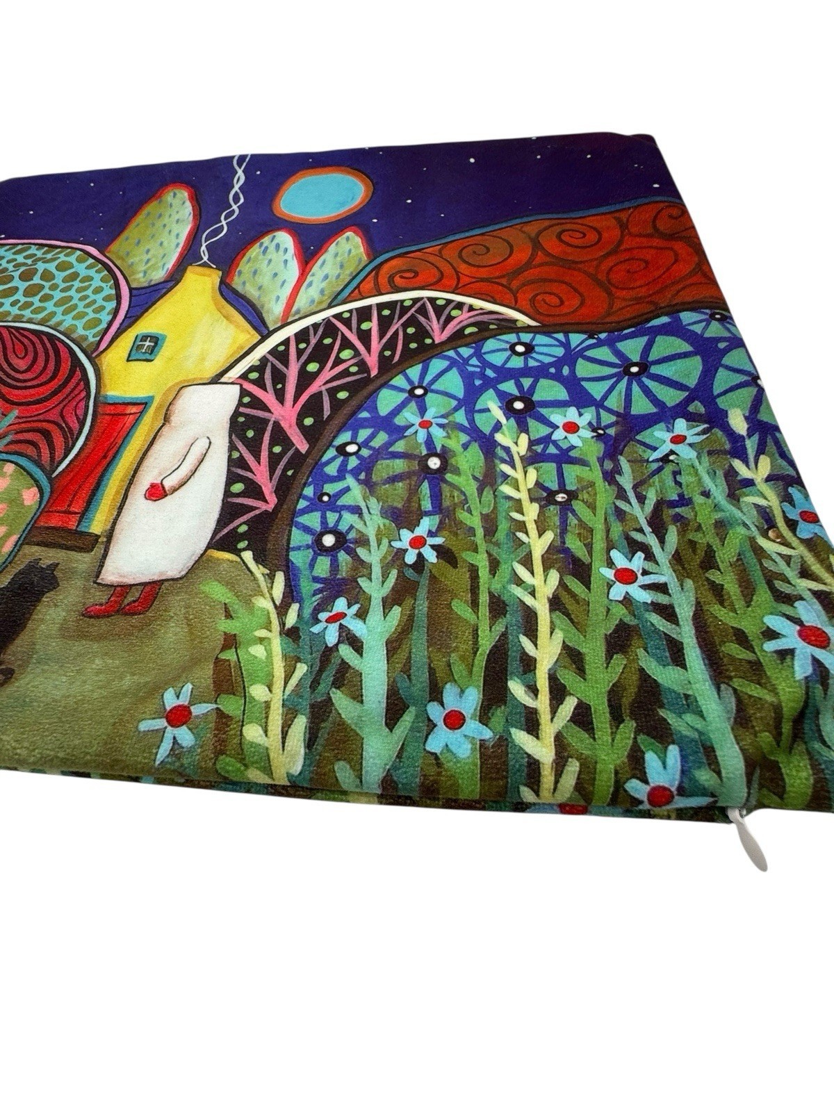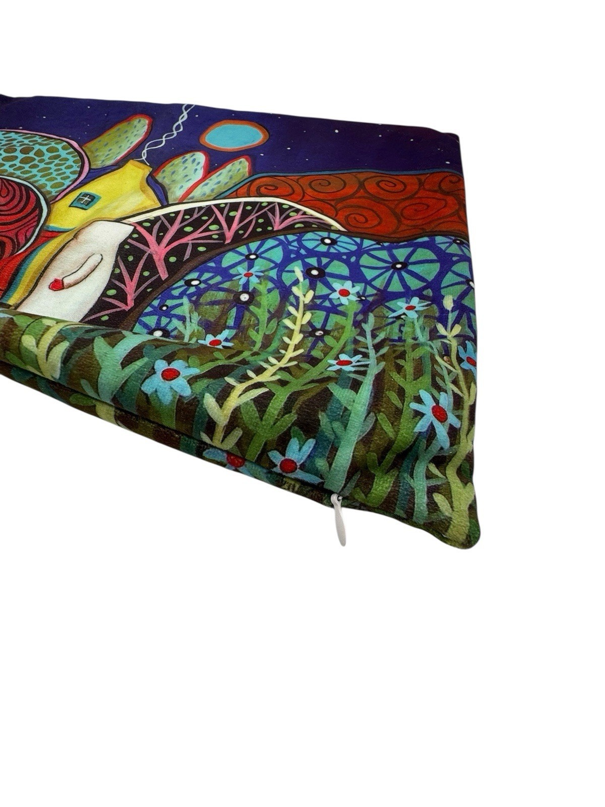 Karla Gerard's Blue Moon art on a throw pillow cover Measures about 20" x 14" No Insert Zipper closure 100% Spun Polyester Poplin Fabric Picture is on both sides Lightly used with no flaws to mention. The photos are useful for seeing condition and other details. Photos are of the actual item you will receive.
