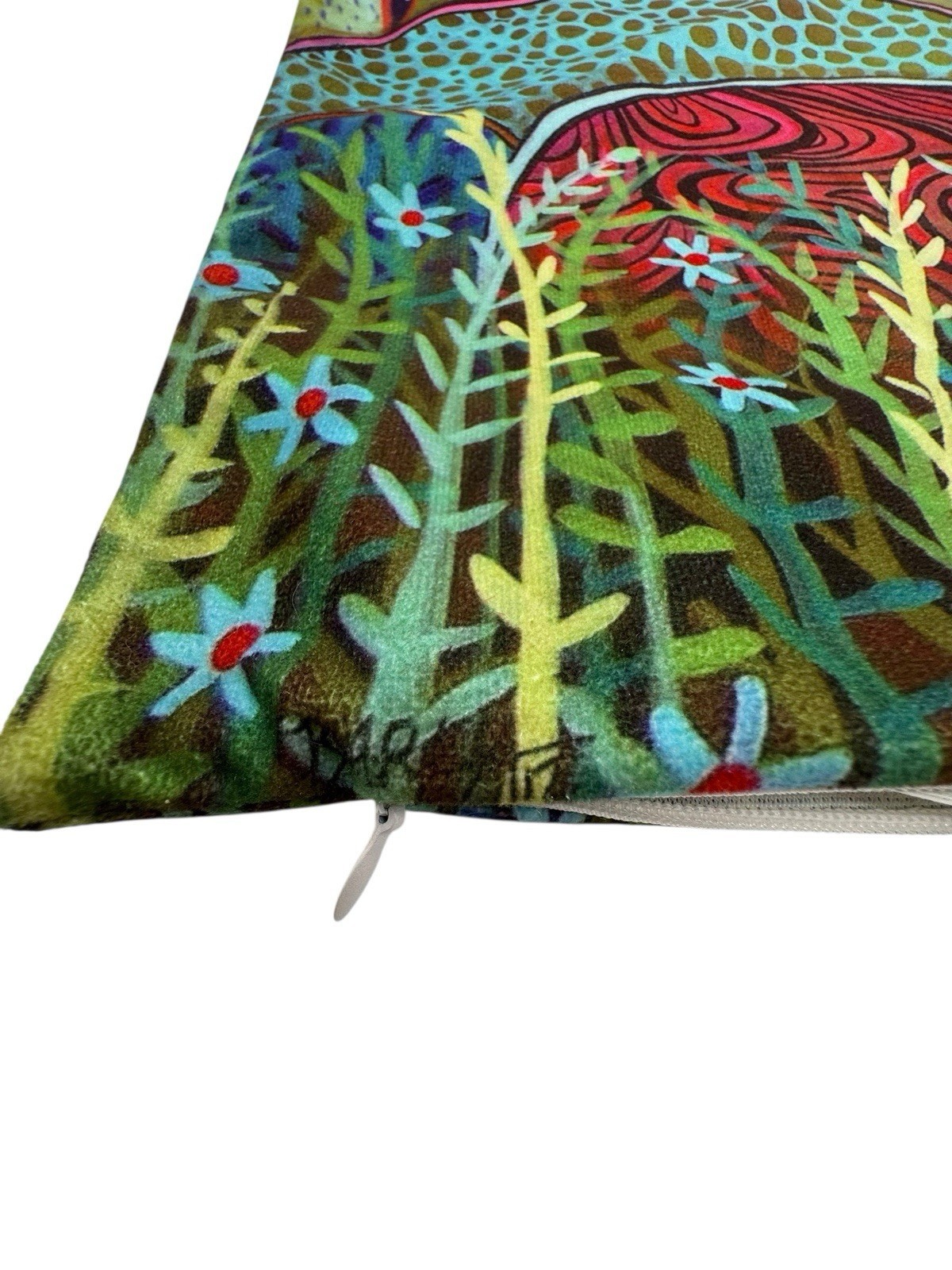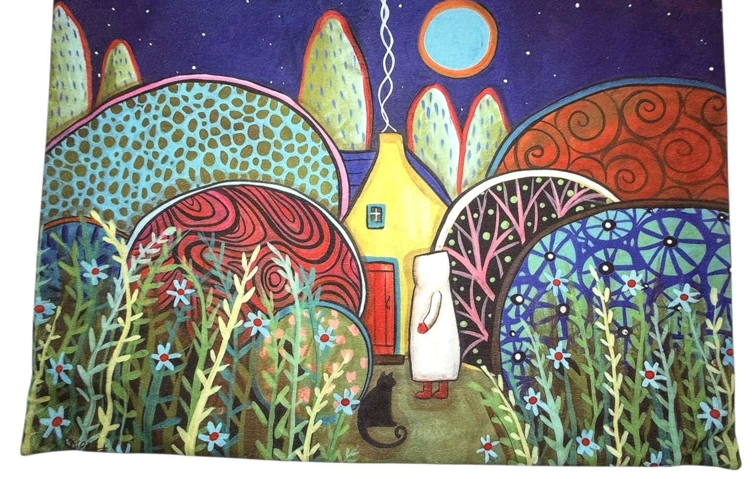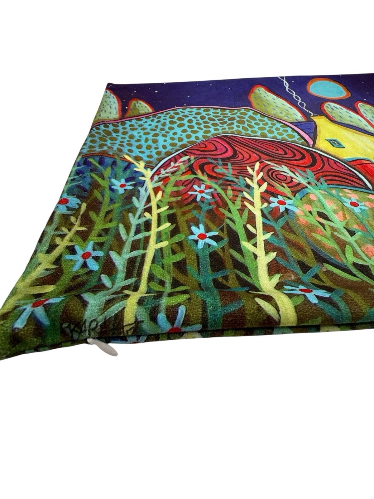 Karla Gerard's Blue Moon art on a throw pillow cover Measures about 20" x 14" No Insert Zipper closure 100% Spun Polyester Poplin Fabric Picture is on both sides Lightly used with no flaws to mention. The photos are useful for seeing condition and other details. Photos are of the actual item you will receive.