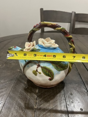 This charming teapot from Blue Sky Ceramics features a delightful floral pattern with Heather Goldmine, perfect for a summer tea party. The original design is licensed and crafted from high-quality ceramic material, ensuring durability and beauty. Measuring 7 inches in height, this teapot is ideal for serving tea to your guests or adding to your collection of decorative pieces. The Blue Sky brand is known for its exceptional quality and this teapot is no exception. Add a touch of flower-themed elegance to your home with this lovely piece.