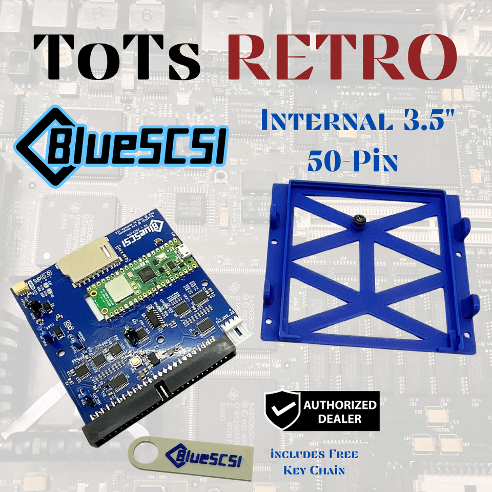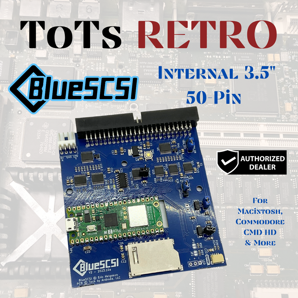 BlueSCSI v2 3.5" Internal 50-pin SCSI Emulator, Brings the Future into your Retro Vintage Computer. This Device effortlessly emulates up to 7 Simultaneously. Hard Drives, CD-ROMs, Tape Drives, MO, Zip and even network Adapters. BlueSCSI is your all-in-one solution. Swap your aging mechanical drive for Solid-State reliability, Powered by Raspberry Pi Pico 2w (RP2350) up to 33% faster than previous models. BlueSCSI v2, takes your Vintage Computers into the future. Works with Macintosh, Amiga, Atari, PC and More. If your computer has an SCSI interface, chances are BlueSCSI v2 is your answer. This BlueSCSI v2 is Assembled By ToTsRETRO, a division of ToTsRC