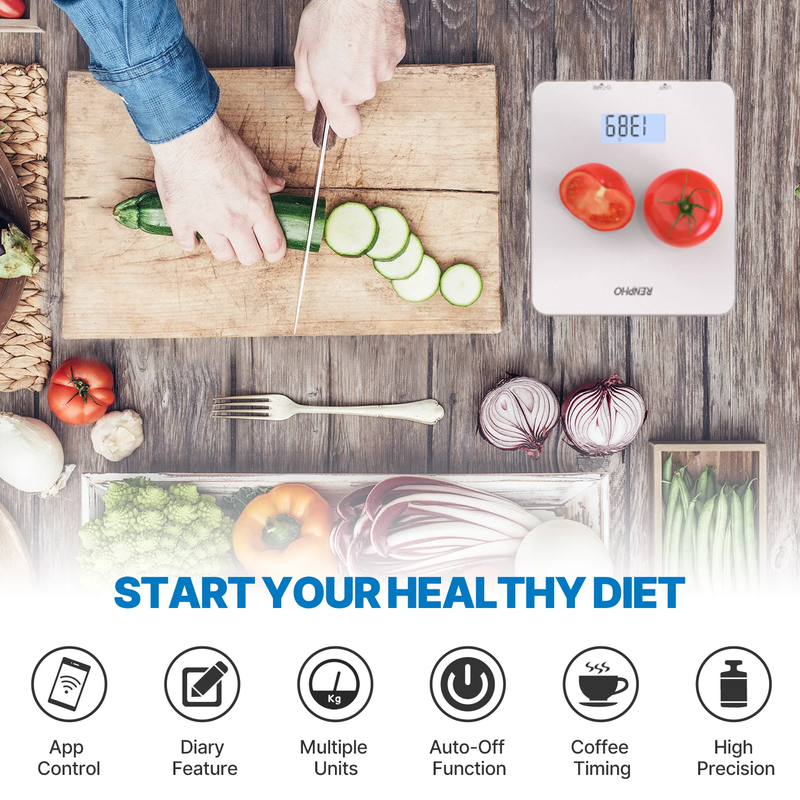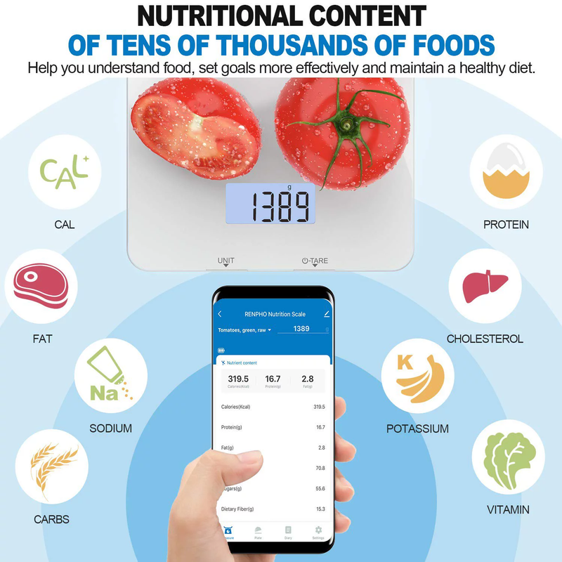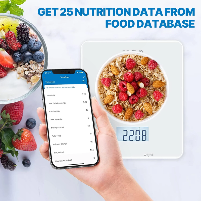 RENPHO multi-functional Bluetooth food scale work with smart app. The Gennec app has the nutritional content of tens of thousands of foods. Detailed nutrition information can help you accurately calculate the number of calories and carbohydrates you consume in order to plan your health goals.