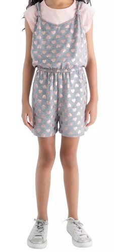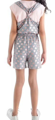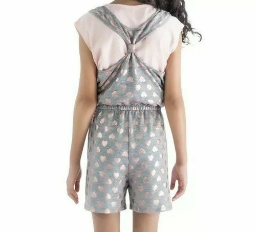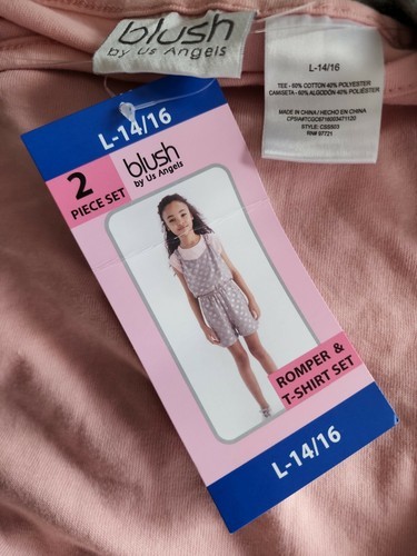 This sale is for a Girls' ~ Blush by US Angels? Romper T-Shirt Set Youth Size Large (14/16) Model No. 1468871 Gray pink in color ~ heart pattern throughout Wide straps Front ~ hand pockets Elastic around waist area 95% Polyester ~ 5% Spandex Inseam measures approximately 4.5" Leg opening measures approximately 11.5" across ~ while lying flat Short sleeve ~ soft knit tee in pink ~ 60% cotton ~ 40% polyester Machine wash ~ Tumble dry Items are new with tags Please view photos for a good description of this item Thank you!