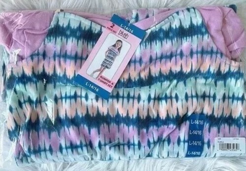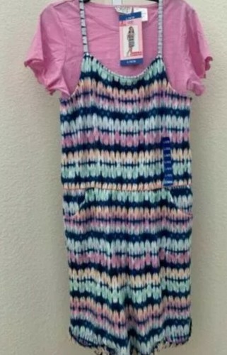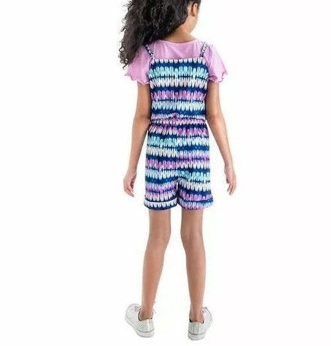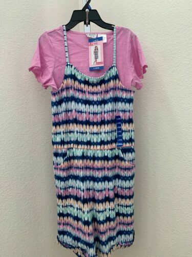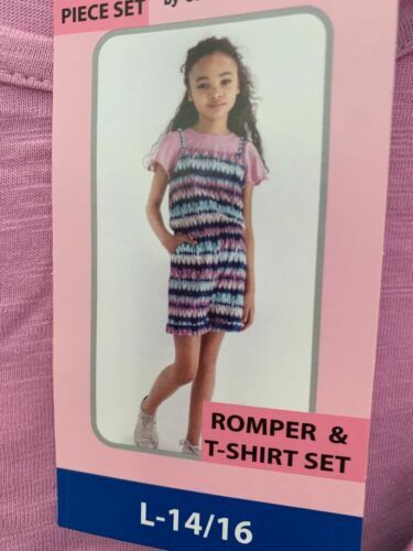 This sale is for a Girls' ~ Blush by US Angels? Romper T-Shirt Set Youth Size Large (14/16) Model No. 1468871 Romper is a purple with a multicolored tie dye pattern throughout Adjustable straps Front ~ hand pockets Elastic around waist area 95% Polyester ~ 5% Spandex Inseam measures approximately 5.25" Leg opening measures approximately 11" across ~ while lying flat Short sleeve ~ soft knit tee in purple ~ 60% cotton ~ 40% polyester Machine wash ~ Tumble dry Items are new with tags Please view photos for a good description of this item Thank you!