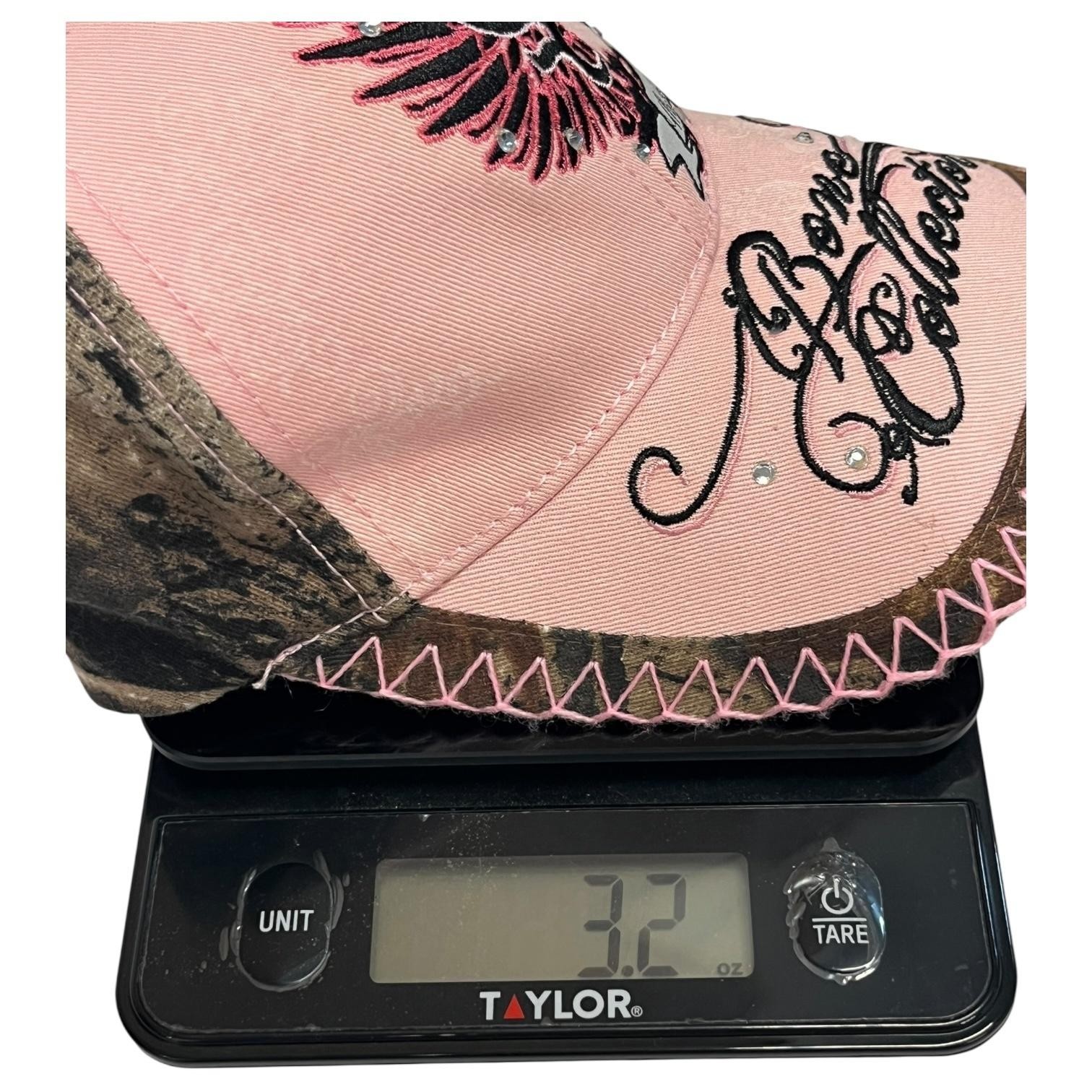 Bone Collector Hat Cap Strap Back Pink Camo Rhinestone Michael Waddell Skull Subject/Brand: Bone Collector by Michael Waddell (Paramount Outdoors label inside) Tag info: One Size Fits Most; 75% Cotton, 25% Polyester; Made in China; Style/lot: 268 Color/Pattern: Pink front with camouflage sides, back, and underbill Front design: Embroidered skull with antlers and wings; banner reads "Michael Waddell" Bill/visor: "Bone Collector" script with rhinestone accents and pink whipstitch edging Back details: Embroidered "BC" with wings; interior taping printed "BONE COLLECTOR" with logo Style: Hat Cap, Strap Back adjustable closure Fit: Adult adjustable; one size fits most Use/Theme: Outdoors/hunting inspired graphic style Special notes: Structured front panels; curved brim; rhinestone accents add dimension Excellent pre-owned condition - light signed of wear - see pics and ask questions for more details.