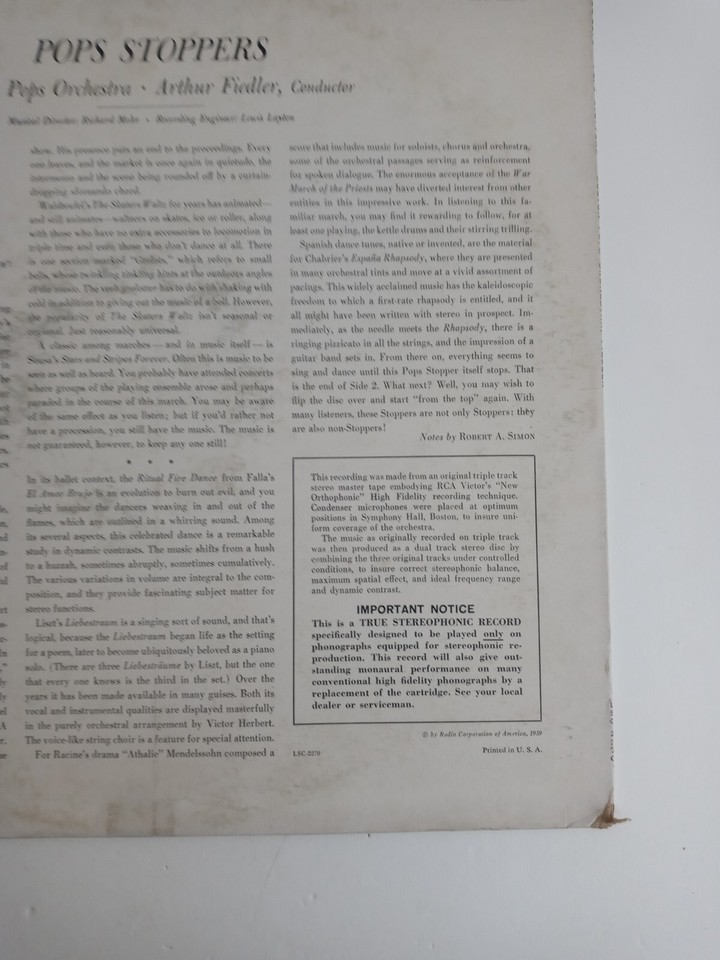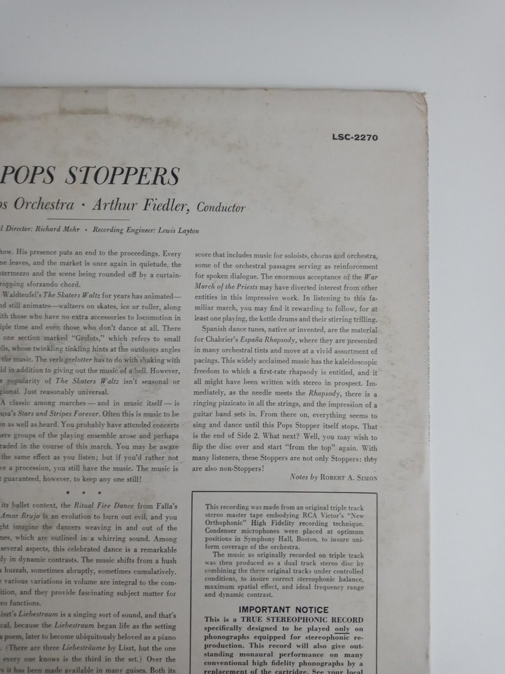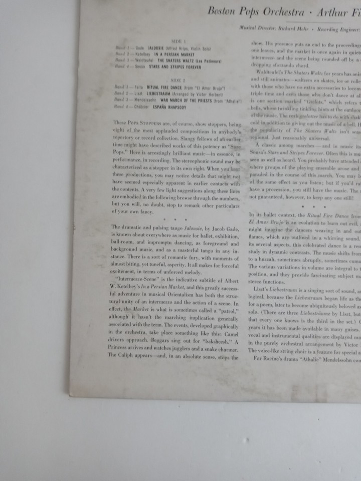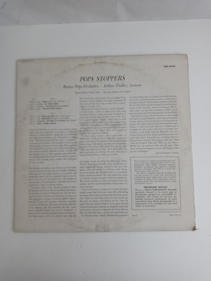 This is for a Boston Pops Orchestra Arthur Fiedler ?Pops Stoppers 12" Record 1959. Shipping: Items ship within 1-2 business days after payment. Items paid on a Friday or weekend will ship the following Monday. US ship time: 2-7 business days. Yes we do combine shipping please add items to your cart for price thanks. Payment: We accept all types of payment's Returns: If you are not satisfied with your product then returns are accepted within 30 days after purchase if item comes back in condition it was sent. Items that are new with tags must come back with tags.