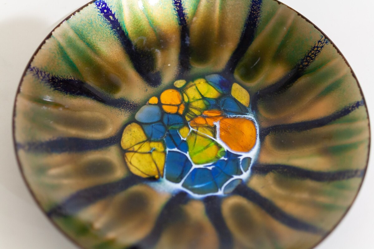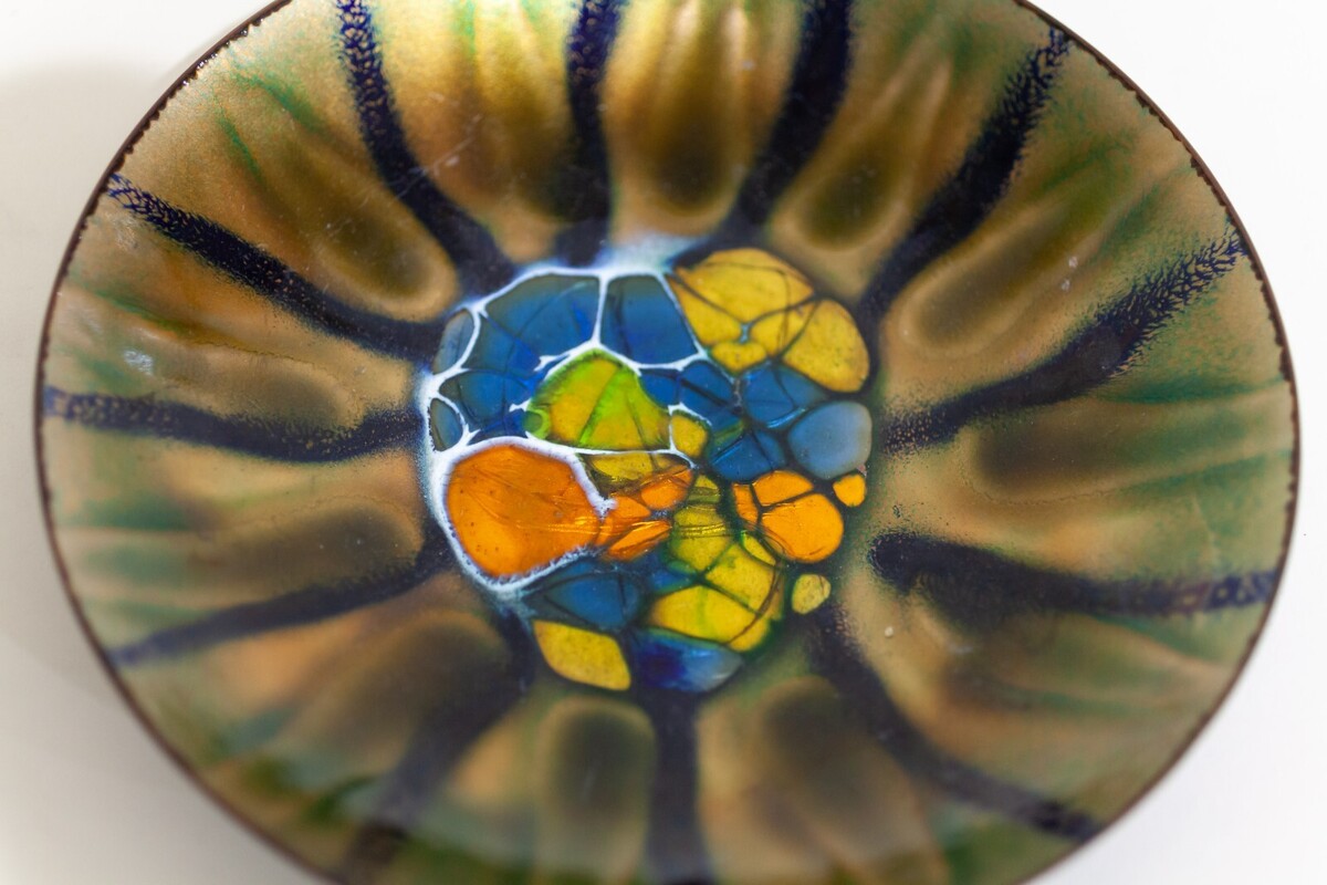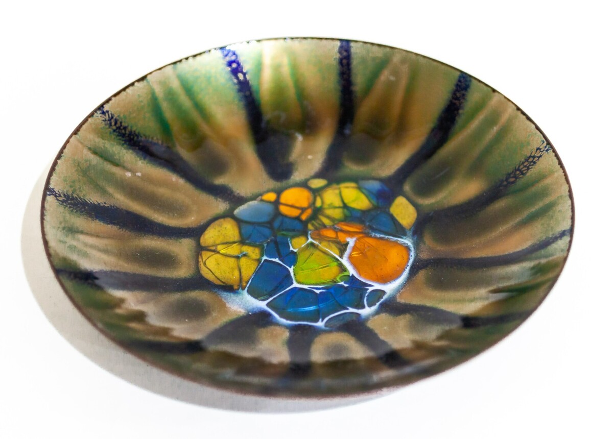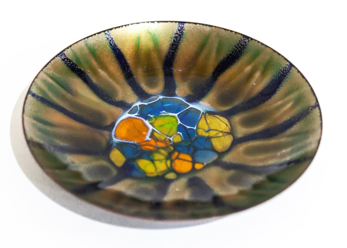Assiette en email sur cuivre du milieu du siecle de Bovano of Cheshire 9"